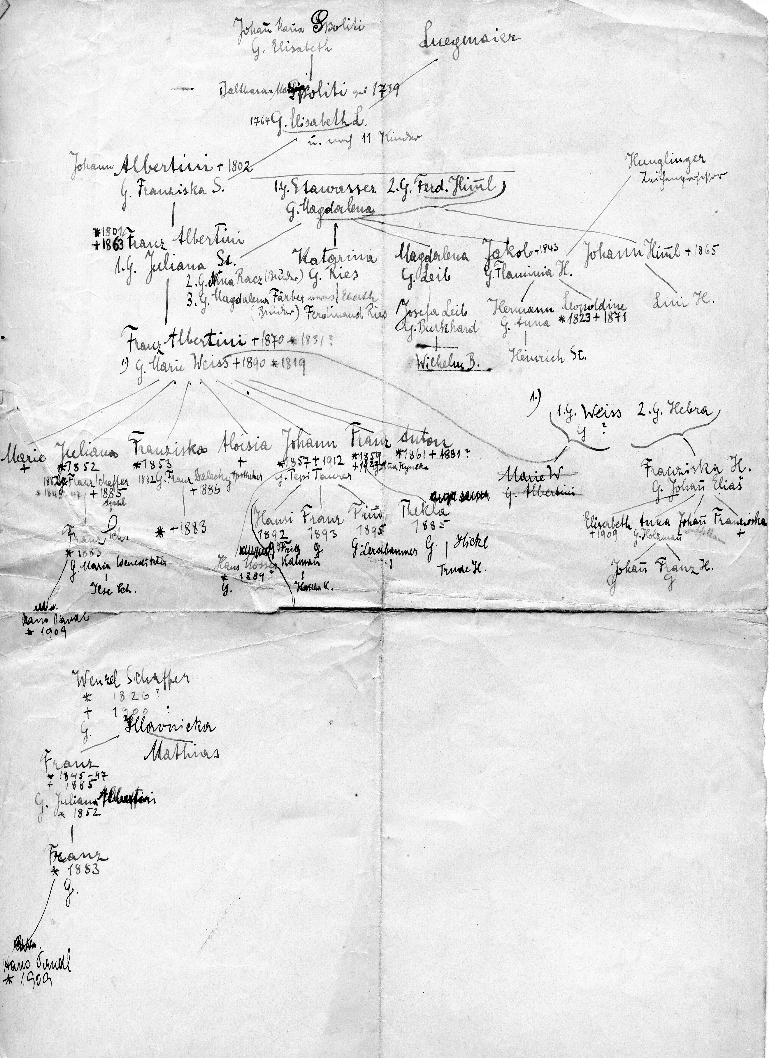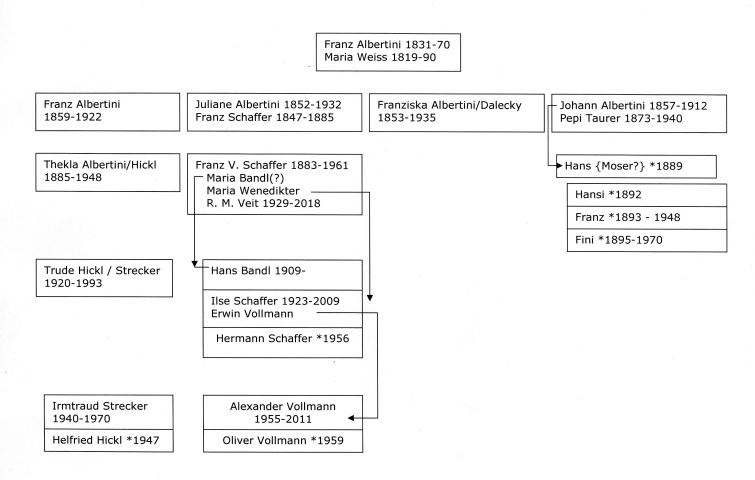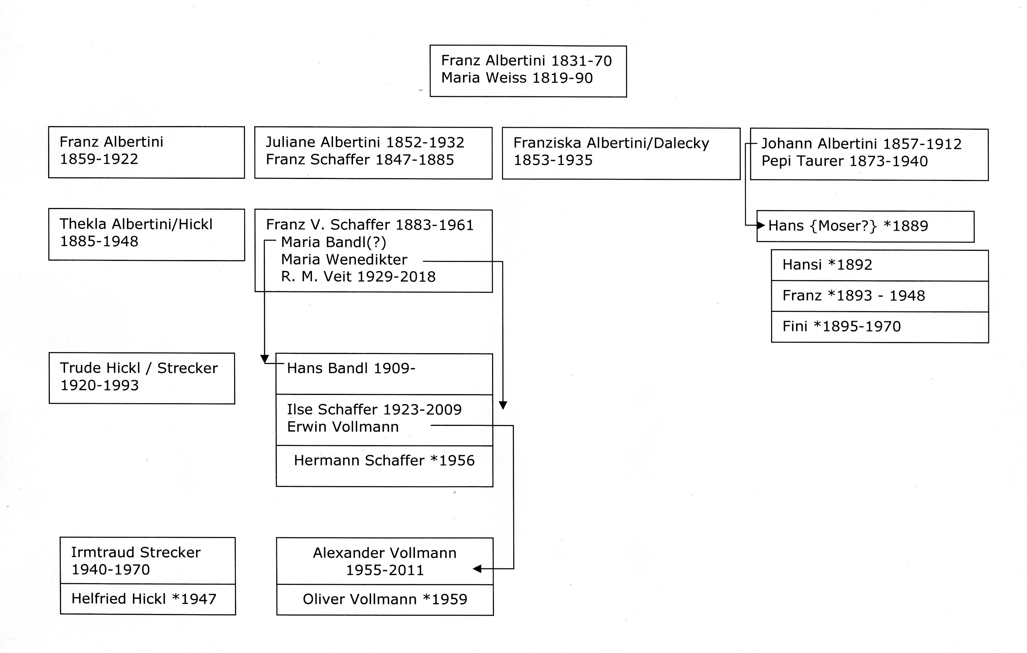 Stammbaum als .pdf Datei. Beruht auf der obigen Zeichnung. Vereinfacht (Daten VOR Franz Albertini *1831 weggelassen), Daten ergänzt, erstellt von H.S. 2020.