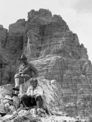 7.9.54 Die lange ersehnte Tour, die Kleine Zinne über die Norwand (fett und unterstrichen von HS), soll heute zur Ausführung gelangen - ob wir es wohl schaffen werden? Kurz vor 7h verlassen wir die Hütte und stehen in 35 Min. am Patern-sattel. Entlang demFuß der prallen Wände gelangen wir zum mir schon von früher bekannten Einstieg, dem markanten Band, das nach rechts hinaus in die glatte Südwand führt. Hier wird das Seil genommen und es ist kurz vor 8h als wir das Band betreten, das fast horizontal weit hinausführt um an einer Kante plötzlich gänzlich ab¬zubrechen. Aber ist die kletterbare Stelle, die die fürchterliche Wand überlistet. Sie erscheint mir heute abweisender als damals, wo ich einen mir überflüssig erscheinenden Haken herausgenommen hatte. In halber Höhe ließ ich Rösli nachkommen, bei einem Haken, der mir zur Sicherung sehr erwünscht war, dann ging es wesentlich leichter bis oben. Nun folgte der lange schräge Anstieg nach rechts in leichter Kletterei und die Querung nach links zum Nordwandsattel, den wir um ca 11h erreichten. Jetzt kommt die Entscheidung. Damals hatte ich allein bis zur grauen Wand, das heißt bis dorthin recognosciert, wo an glatt erscheinender Wand ein Stück nach links hinaus zu queren ist, was mir damals sehr gewagt erschien. Aber heute komme ich ohne Zögern glatt darüber hinweg und weiter. Im weiteren Verlauf der genußvollen Kletterei bin ich bei einem tiefen Riß wieder ein Stück zurück, da ich erkannte, daß es draußen leichter sei. Höher oben finde ich unter einer sehr schwierig erscheinenden Fortsetzung des Risses - es dürfte die Stelle sein wo man auch nach rechts ausweichen kann - 3 Haken zur Sicherung, die mir nicht unerwünscht sind. Und dann haben wir es geschafft. Um 12h07 stehen wir am Gipfel der Kleinen Zinne mit einem unbeschreiblich glückhaften Gefühl der Befriedigung über eine ungewöhnliche Leistung.