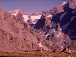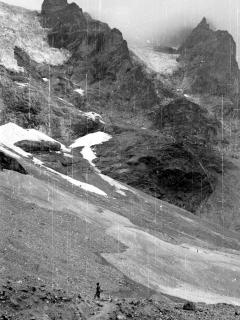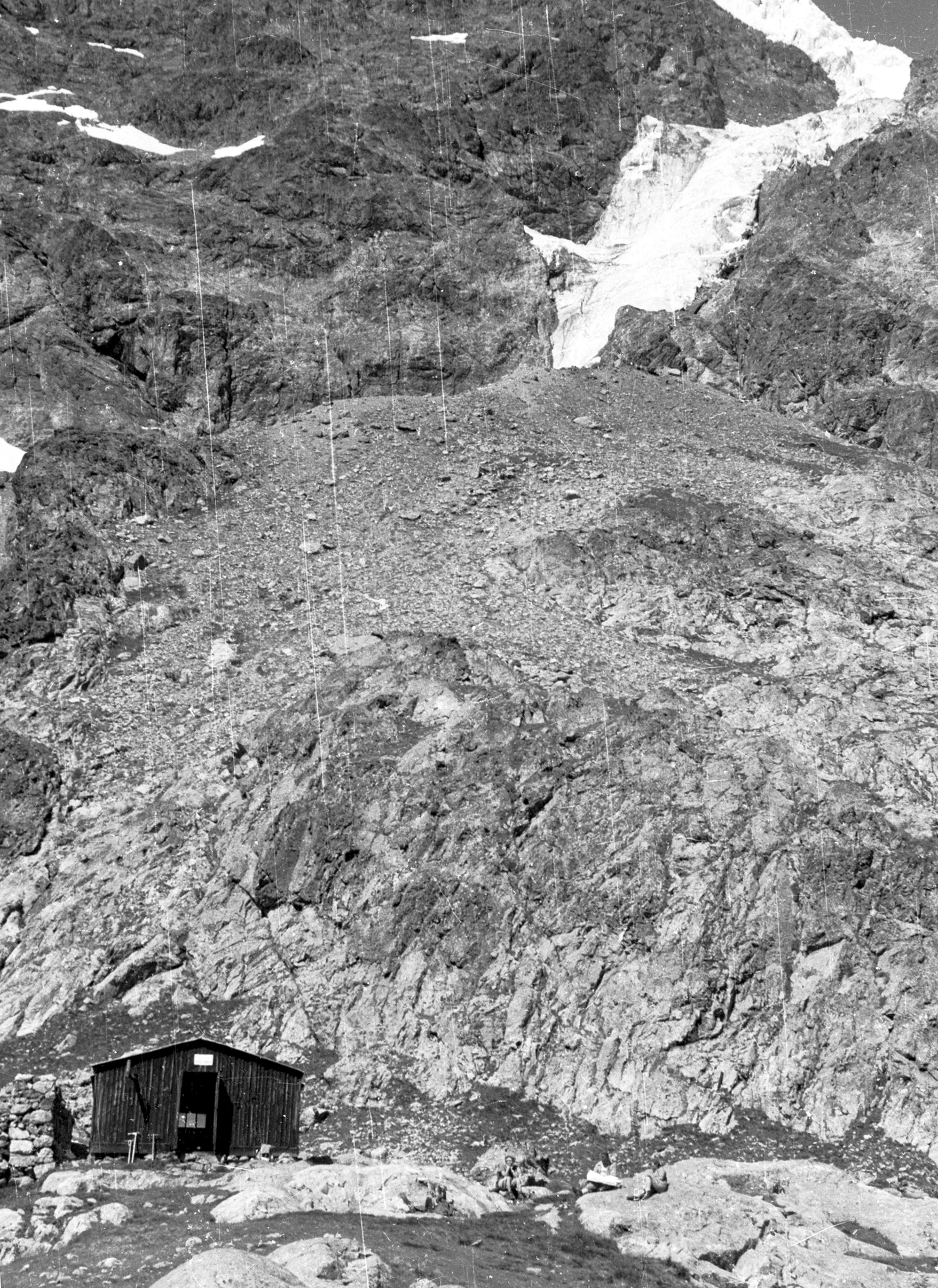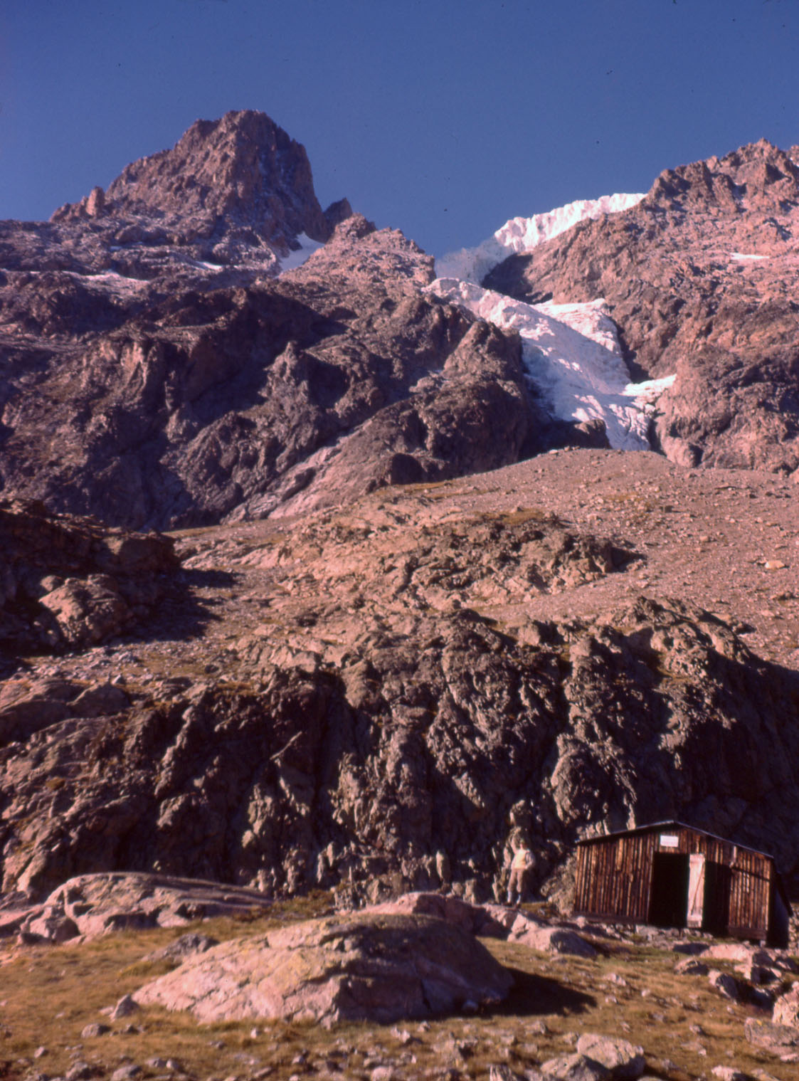 Schutt- u. Felsenhang in Serpentinen hinauf zum Refuge Glacier Blanc. Hier
