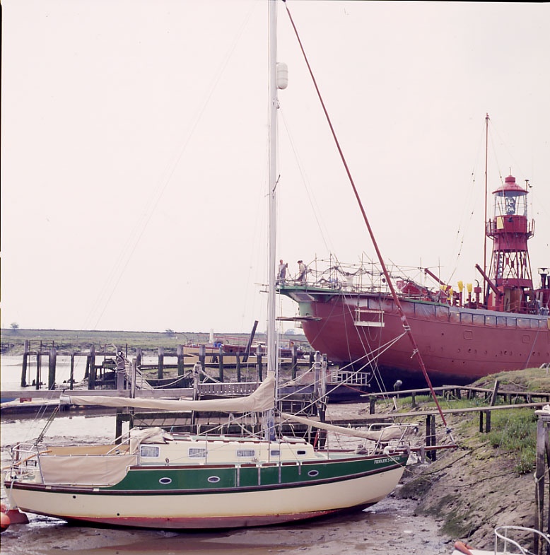 schwarze fette Schlamm glänzt. Ein Leuchtfeuerschiff, das zu einem Wohnhaus