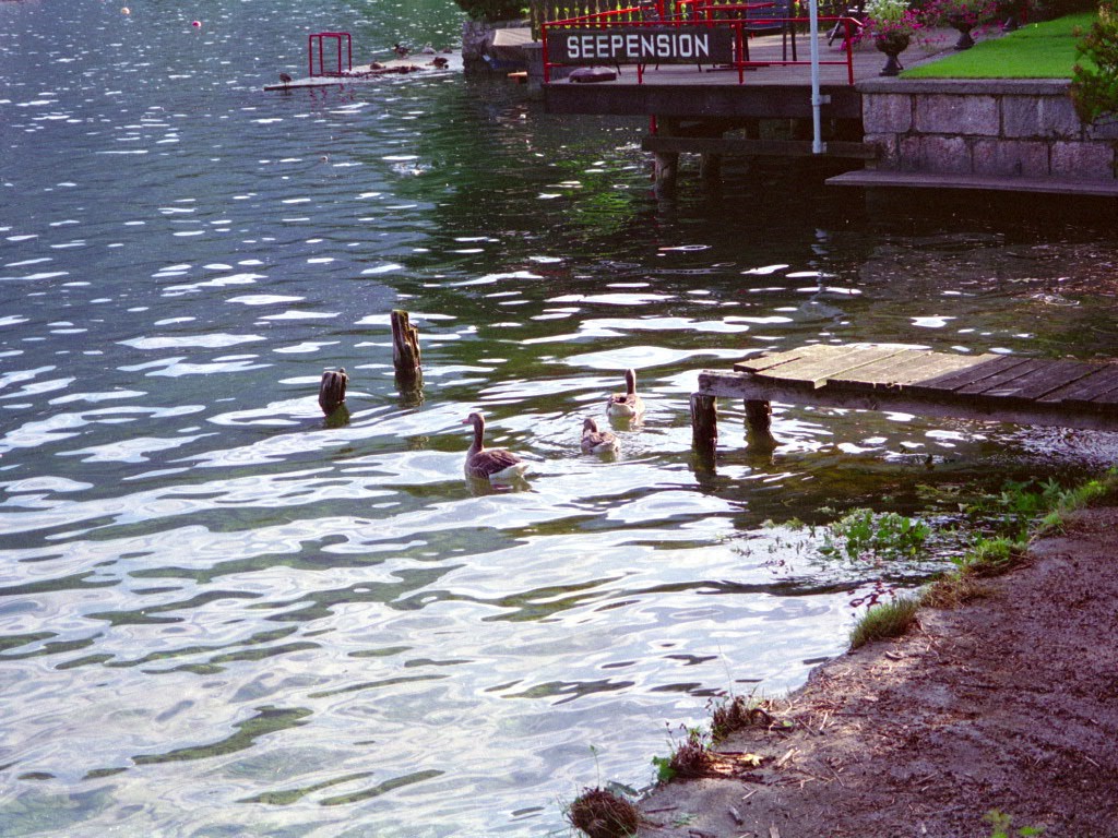 (16. So) Nach dem Frühstück Abfahrt um ca. 1000; über Flaach, Andelfingen und Stein am Rhein nach D. Am Bodensee entlang, nach Überlingenrein, 100 DM abheben, an Unter-Uhldingen vorbei. In der Nähe von Lindau tanken (zahlen nicht, was wir erst 2 Tage später feststellen, da ich annehme Brigitte habe bezahlt und umgekehrt). Weiter ins Allgäu, Rast am Alpsee bei Immenstadt, weiter noch bis Weissensee bei Füssen; Seerundwanderung, Jugendorchester, das sehr gut spielt, ein erstaunlich guter Wein mit einem feinen Muskatelleraroma. Übernachten auf Parkplatz vor einem Lebensmittelgeschäft.