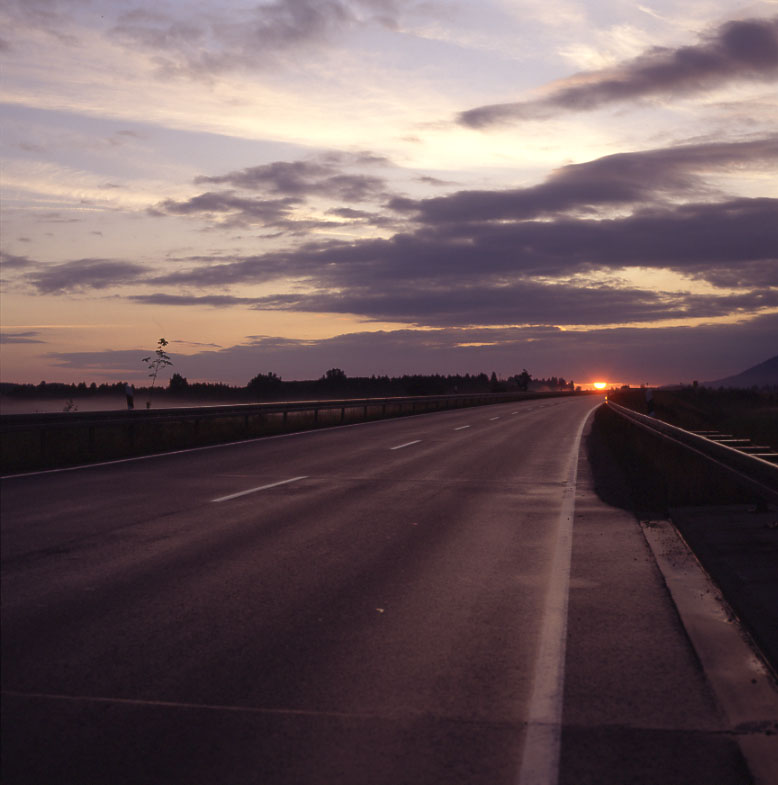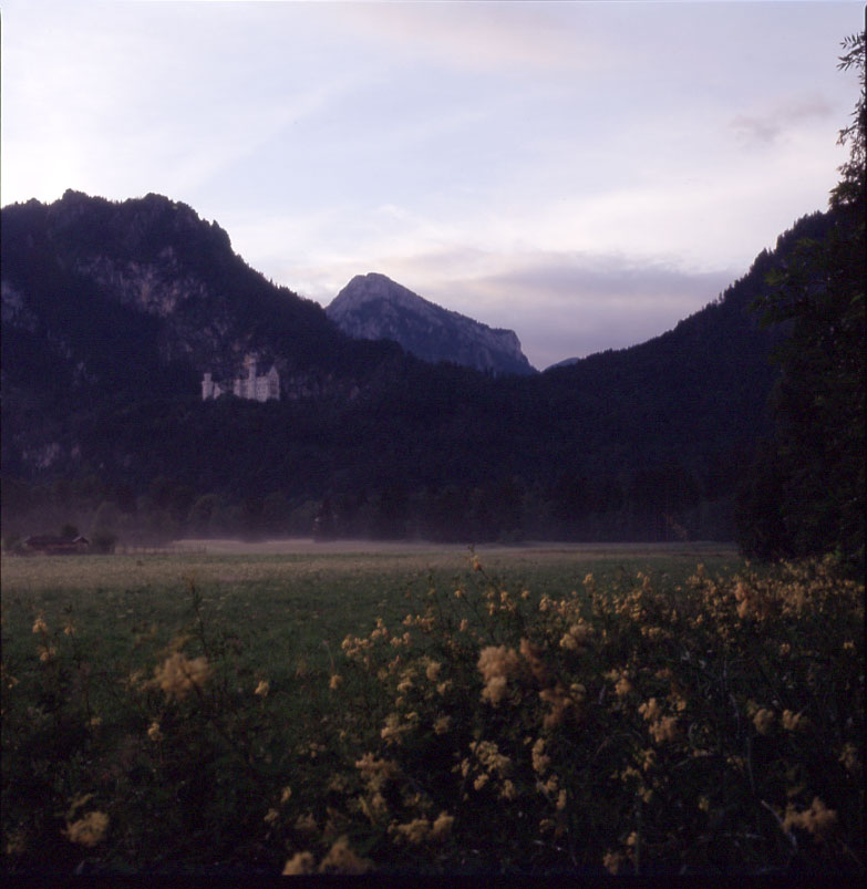 (17. Mo) 0530 Abfahrt. Durch Füssen und vorbei an den Schlössern Neuschwanstein und Hohenschwangen. Frühstück zw. Unter- und Oberammergau, kl. Abstecher ins Zentrum von Oberammergau. Kurze Besichtigung der Stiftskirche von Ettal. Das Innere eine Scheusslichkeit baroker Überladenheit, jede Menge verlogener Beweihräucherung hoher Herren und in der Kuppel ein Himmel der ausschliesslich von Nonnen, Mönchen und Kardinälen bevölkert ist. Weiter über Bad Tölz und vor Rosenheim auf die Autobahn. Stau vom Chiemsee rückreichend. Fahren bei Bernau ab, aber stehen noch eine weitere Stunde auf der Landstrasse im Stau. Sobald wir den Stau hinter uns haben, sehr gemütliche Fahrt durchs Land; späte Mittagspause vor einer Scheune mit Diskussion über das Phantastische. - Es gibt ganz verschiedene Dimensionen des Phantastischen, - mehr oder minder wahrscheinliche Zukunftsvisionen, - überraschend Abstruses, Eigenartiges, - die Uminterpretation der Wirklichkeit ins Magische, - und das Entdecken des scheinbar Alltäglichen als das Besondere. - Bei Salzburg problemlos über die Grenze. Weiter nach Obertrum am Trumersee. - Es ist schön am Trumer See. Aber ich bin rastlos und unzufrieden. Algäu und Salzkammergut können mich als Ferienland nicht reizen, sie sind viel zu besiedelt, zu zivilisiert, zu aufgeteilt, zu arm an urtümlicher, freier Landschaft. Ein Zauber kann kann, obwohl es recht schön ist, nur im Kleinen liegen, in Gras, Moosen, Steinen, Bäumen, verwittertem Holz. Hinter dem Horizont warten keine Überraschungen.