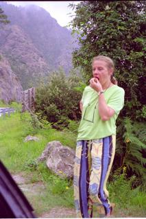 Bett sehr hart, Hundegebell nervt mich vor dem Einschlafen, Hermann schlummert schon. Frühstückchen Kaffe, 1 Pannino, Butter, Marmelade, H. 1 Brioche - ein Hohn gegen das Frühstück bei Nicole Rabbi in Orches. Dann auf die Bank (mit Räuberschleuse). Ich muss mein Beautycase draußen lassen, weil zuviel Metall dran ist. Hermann wechselt 500 $ in Travellerchecks; in die Trafik, Abfahrt um 0900. Erst beim Verlassen der Stadt kommen wir drauf wie groß und malerisch sie ist. Also nochmals kurze Fotopause im Flussbett und Marsch zur römische Bogenbrü-cke. Dann aber um 0930 weiter durch den Ligurischen Apennin . Ständig bergauf und bergab, dem Flusslauf folgend, meist sehr ausgesetzt und sehr schmal. Die Vegetation ist eintönig, die Orte schmücken hier die Landschaft ebensosehr wie sie anderswo stören. Der größte Ort auf der Strecke ist Ottone. Ab hier gibt es mehr Verkehr, auch Gegenverkehr. Die Ansiedlungen sind belebter und wirken immer südländischer. Auch die Vegetation nimmt einen mediterranen Charakter an. Kaf-fee- und Bierpause ist angesagt um dem ständigen Linksherum, Rechtsherum zu entgehen.