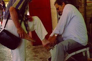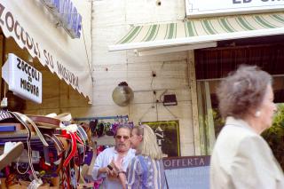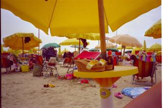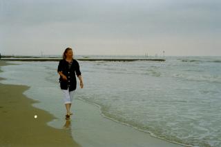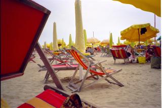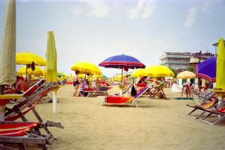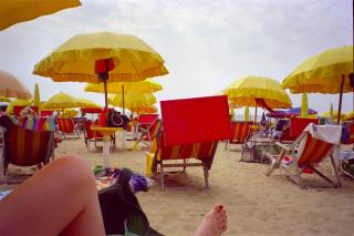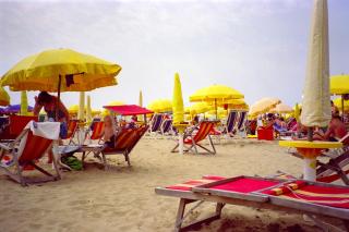Ganz gut geschlafen. Obwohl -, ein Bett mit "Eheschlitz" macht mich fertig. Frühstück auf der kühlen Terrasse, später an den Strand. Sonntag - also Millionen Leute. Im Strandkaffe zwei Cola, bald wieder zurück in den Garten, Picknick im Schatten, Abkühlung im Plantschi. Hermann schläft, Kopfwaschen, mein Föhn läßt sich hier nicht anstecken. Dann Mani- und Pediküre. Wieder ans Meer. Jetzt gehe ich zum ersten mal ins Wasser. Es ist angenehm warm und zum Glück nicht tief. Ich schaukle in den Wellen. Gegen 1700 spazieren wir in die Stadt. Ich bekomme zwei Paar "zoccoli su mesura" (Kork- und Holzpantinen zu denen man sich das Halteband aussuchen kann und das genau auf die Höhe des Ristes angepasst wird). Bikini zu einem annehmbaren Preis finde ich jedoch wieder keinen. Auf dem Weg zum Abendessen schlendern wir noch an Marktstandeln vorbei, die längst des kleinen Flusses aufgebaut sind - lauter Ramsch.