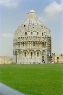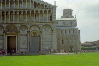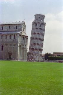 Millionen Leute, kein Parkplatz. Der Domplatz ist von einer langen Ziegelmauer und Gebäudereihen umgeben. Innerhalb befinden sich die drei sehr beeindrucken-den Marmorbauten (Turm, Dom und Baptisterium) umgeben von weiten (abgesperr-ten) Rasenflächen. Der "Torre pendente" ist wirklich eine phantastische Sache - nur ein bisschen schief ist er halt, - andererseits, wer würde schon einen geraden Turm so bewundern? Umrundung, Marmor-Ei, Pinocchio. Es ist sehr heiß und wir wollen etwas trinken, werden aber so lange nicht bedient, dass wir aufstehen und weiterfahren.