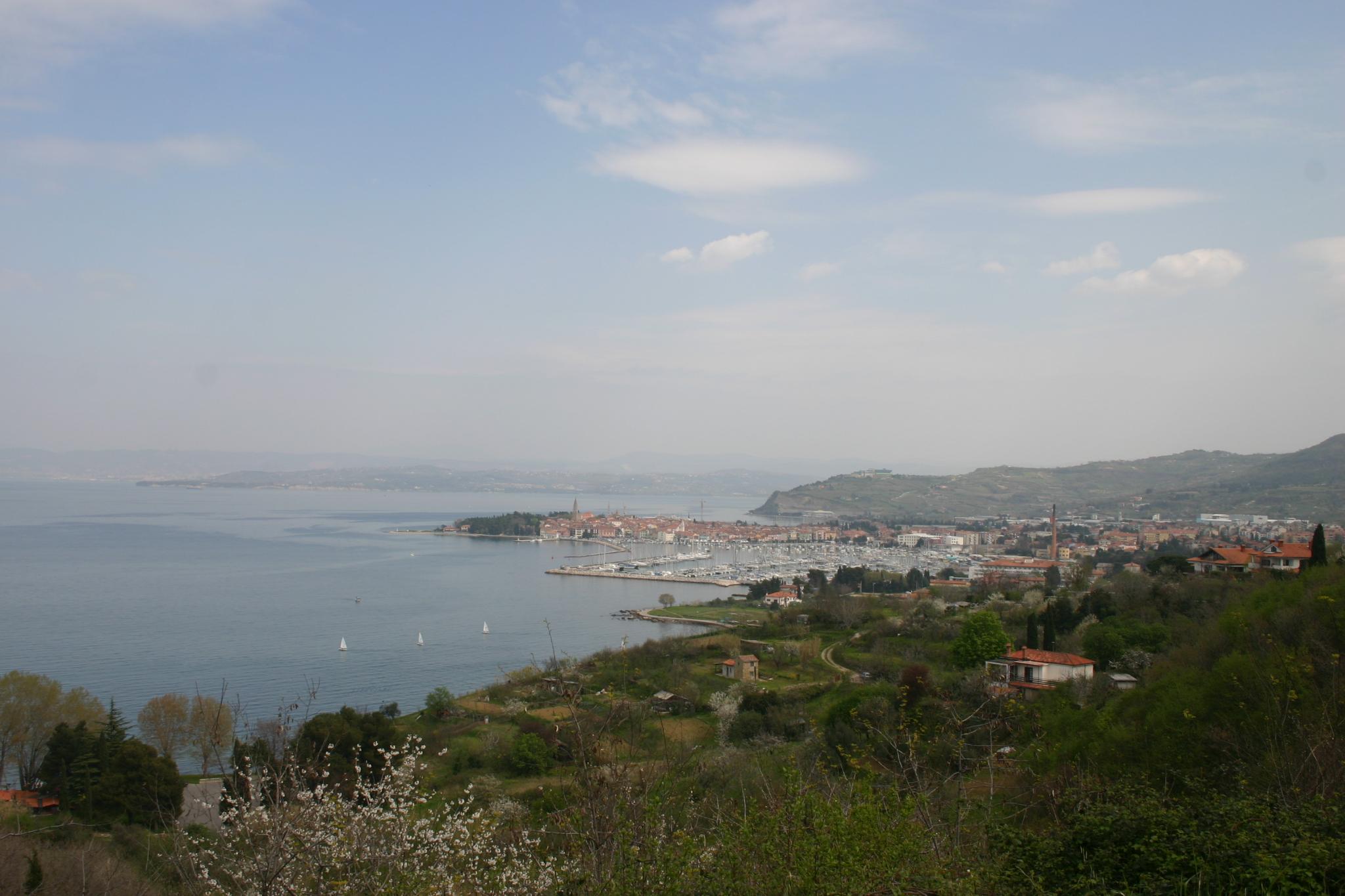 Um 11:45 parken wir in Koper (Capodistria) am Meer. Große Schiffe (vor Triest?) draußen, eine Kindergartentruppe trödelt die Promenade entlang. Fotos. Dann weiter nach Isola, Salina (eine Meerwasserkuranstalt?). - Piran mit alter Stadtmauer am Berg. Versuchen eine steile gepflasterte Straße hinunterzufahren, aber dort geht es nicht weiter (im Nachhinein wissen wir, dass wir dort hätten parken können und in den Ort gehen). Wir wenden mühsam, fahren um den Ort herum und von der Südseite wieder zu. Schranken, Parkplatz. Kaffeehaus, Klo, Bier, Kaffee (3,04). Dann Mittagessen im "Skarabäus": Puten-Salatteller, Risotto mit Oliven und Parmaschinken (eine wenig wohlschmeckende Kombination - gekochter Schinken wäre besser und Oliven und Reis machen sich auch nicht so besonders), 3 Bier; zuerst sitzen wir auf einer Terrasse und sehr schönen hohen Bäumen, aber es ist zu kalt; ziehen an die Hausmauer um und dann in das Innere des Lokals, - eur 22. Es liegen sehr, sehr viele Boote im Hafen - aber Hermann gefällt keines. Parkgebühr 2,64 für anderthalb Stunden.