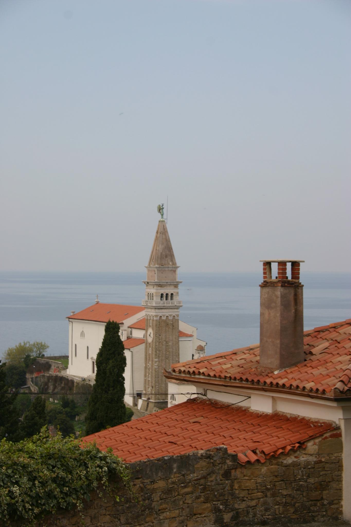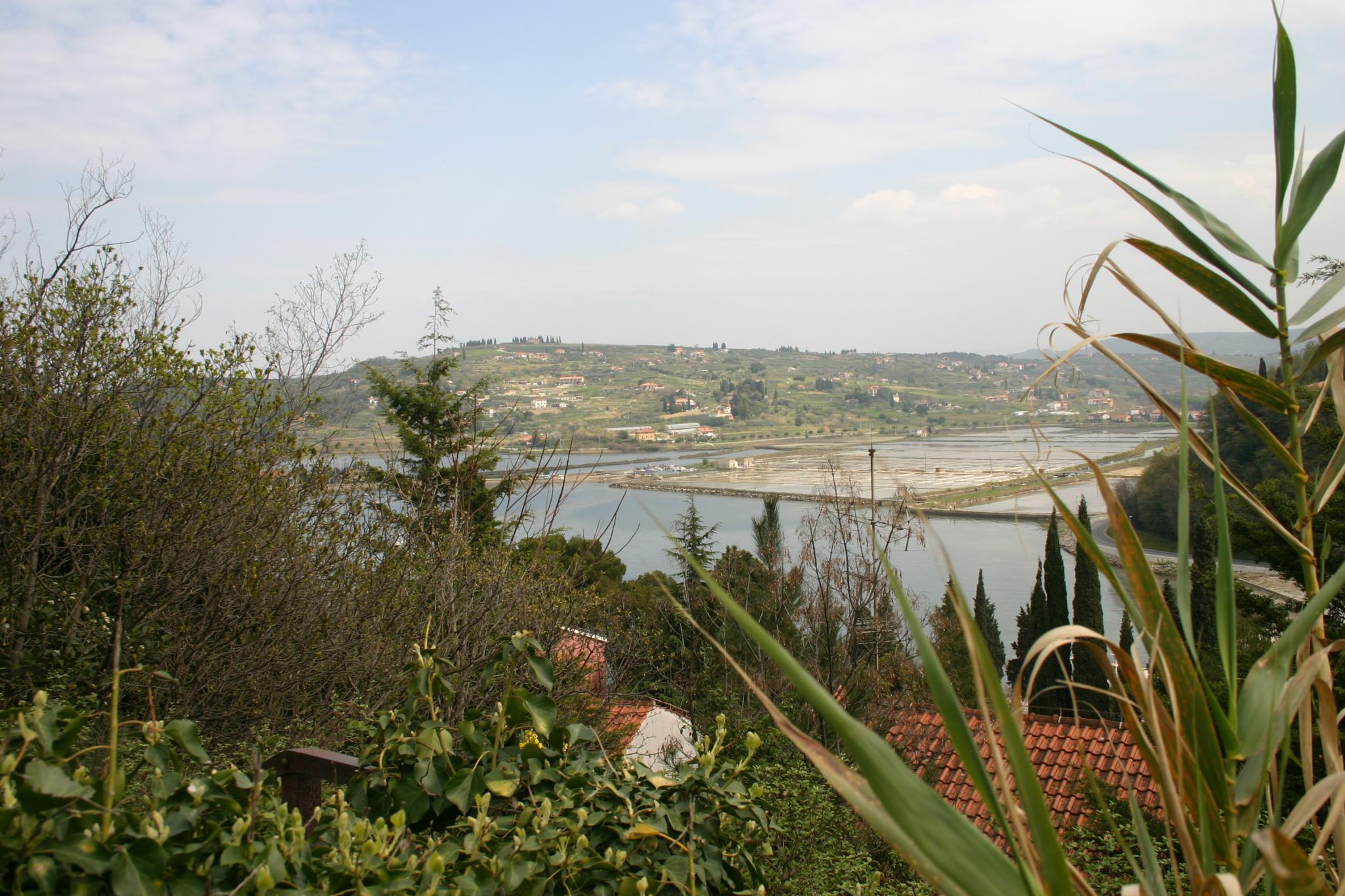 Weiter nach Portorosz. Parken auf einem sehr engen Parkplatz schräg vor einem Kaffee mit Rohrstühlen, wo ein bärtiger Mann sitzt. Zu Fuß hinauf zur Kirche; freistehender Kampanile, daneben das Kirchengebäude neu aprikosenfarben gestrichen - nicht sehr passend die Farbe; Gruppe junger Leute die durch die Stadt ziehen. Beim Runtergehen geraten wir etwas weit rechts und gehen am Hafen entlang zurück zum Auto. Auch hier sehr, sehr viele Boote. Danach kommen wir an einer sehr ausgedehnten Salzgartenanlage vorbei - Salina Scicciole (Secoveljske). Hermann parkt mich beim Misthaufen und rennt ein Stück bergauf zurück um ein Foto zu machen.