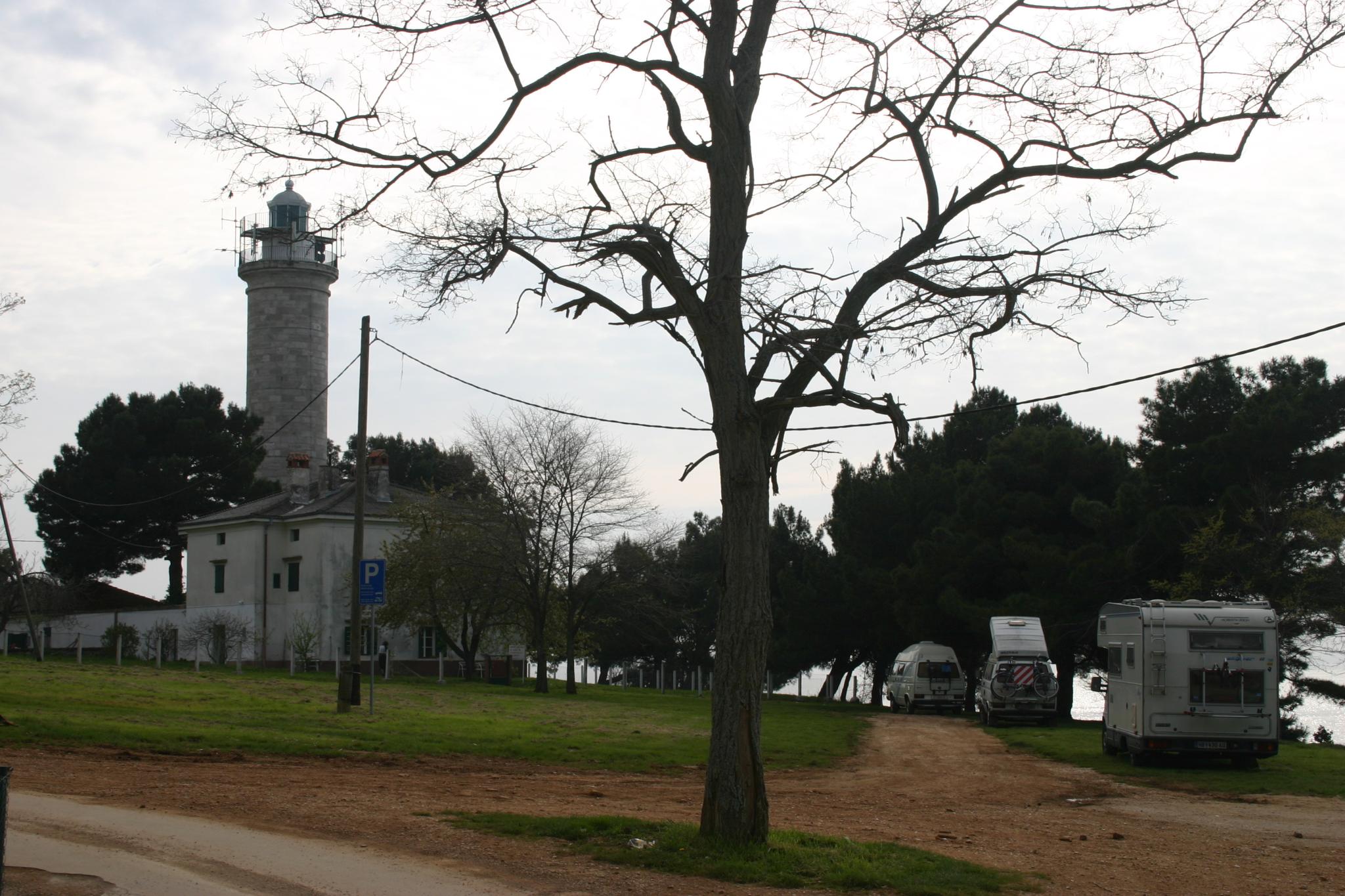 Wir überschreiten die Grenze Sloweniens zu Kroatien. Abzweigung zu einem Camping Kanegra - auch Appartements, sehr schattig - mitten in Naturlandschaft. Wir drehen vor dem Camping Entré um und wollen versuchen den Strand von der anderen Seite zu erreichen. Wir kommen an das Kap Savudrija - A. d. Welt mit Leuchtturm, hässlichem Strand , vielen Neubauten und einer dunkelrostroten Appartmentvilla "Valldepian", die wir später auch im Prospekt finden.