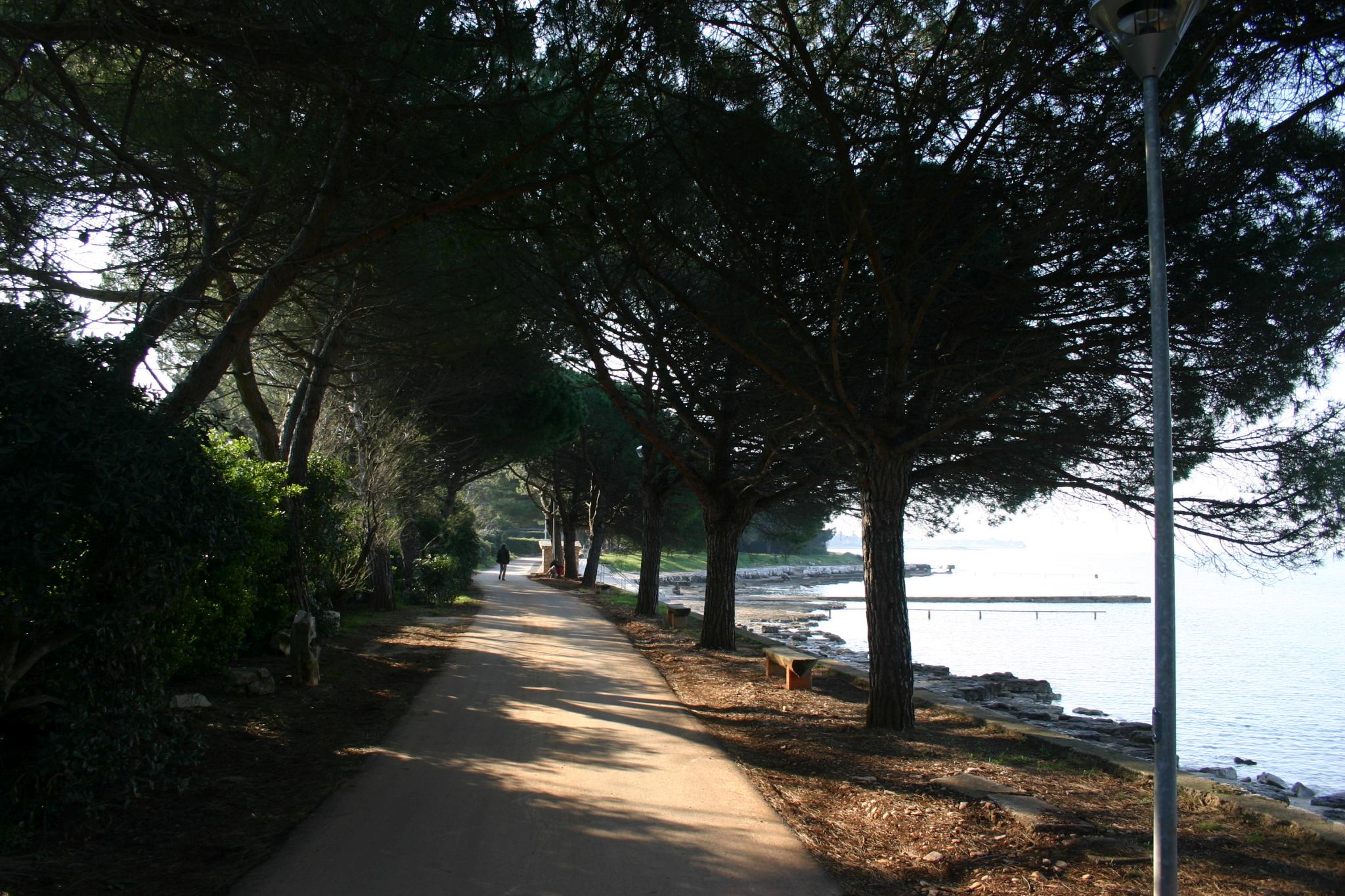 Kaffee und gute Mehlspeis' zum Frühstück, Begleichen der Rechnung 55 € insgesamt, dann fahren wir los, weiter auf unserer Rekognoszierungstour. Gleich nach Umag biegen wir nach Sveti Pelegrin (San Pelegrino) ein. Privatbungalows und ausgebaute Schrebergartenhäuser direkt am Meer. Sehr schattig - Pinien - sehr gute Luft, schöner Strand, alles total verlassen. - Ein Mann mit einem Kleinkind sitzt auf einer Bank. Ich spreche ihn an, wir einigen uns auf English und er sagt, dass er eine (nur eine) Familie kennt, die auch vermietet, alles Privat-Sommerquartiere.