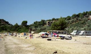 Ein altes griechisches Ehepaar kommt schnurstracks auf unseren Liegeplatz zu. Der Mann schwafelt mich an und zeigt dabei ständig auf einen großen Stein, der im Gras herumliegt. Ich verstehe ihn nicht, antworte auf englisch und lege mich auf das Badetuch. Die zwei klappen grummelnd ihre Strandsessel auf und plazieren sich unter dem nächstgelegenen Olivenbaum. Nach und nach treffen weitere antike Pärchen ein und gruppieren sich dazu. Sie palavern und deuten immer wieder auf den bewussten Felsbrocken, werfen mir ungehaltene Blicke zu. Anscheinend ist der Stein ihr persönliches Zeichen dafür, dass dieser Strandplatz für sie reserviert ist. Pech. - Mittag Rindfl mit Tomaten, Pommes, Salat, gebr. Melanzani, Bier, Uzo, 28,--€