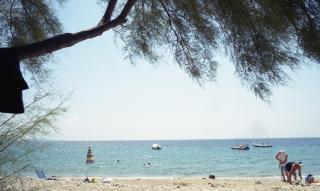 Unser bevorzugter Platz ist bereits besetzt. Wir schlagen im Schatten eines anderen Baumes unser Lager auf. Ich versuche ein Strandkleid zu kaufen (ein Touristenshop im Ort, wo man auch Rundreisen mit der „Africana“ zu den nahen Inseln buchen kann). Alles zu groß, viel zu groß. Frust. Hermann wandert nach Micro… bei der Hitze! Als er zurückkommt, wird unser Platz frei und wir - übersiedeln wieder einmal - unsere Badesachen. (Micro liegt W-lich von Platanias, Kastri östlich).
