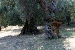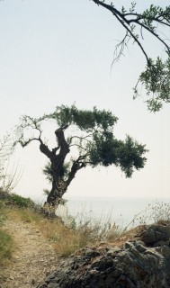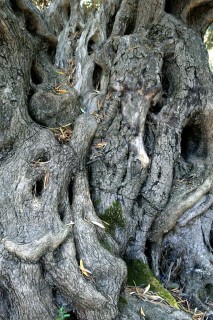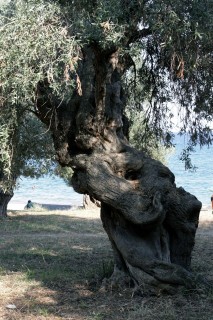 Frühstückszugabe heute eine Art Sterz mit Paradeiesern darauf – verzichtbar. - Hermann mancht eine Bootsfahrt nach Mikro um 2,-- €. Er ist der einzige Fahrgast um 10:00 Uhr früh . Die Kosten für die Rückfahrt werden eingespart, H. geht zu Fuß. Ich mache Fotos von den eigenartig geformten Stämmen der Olivenbäume.