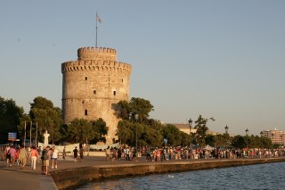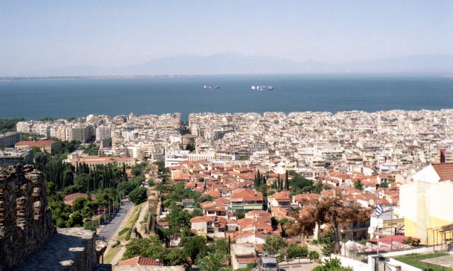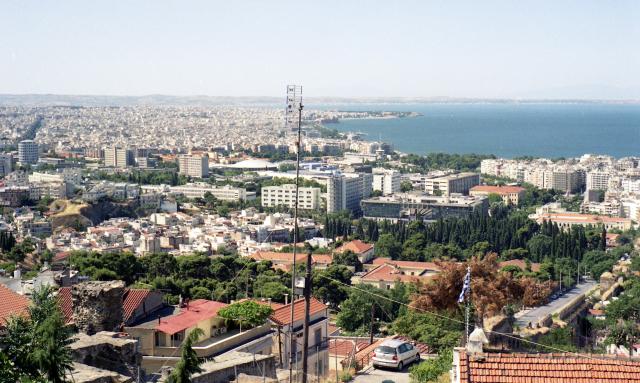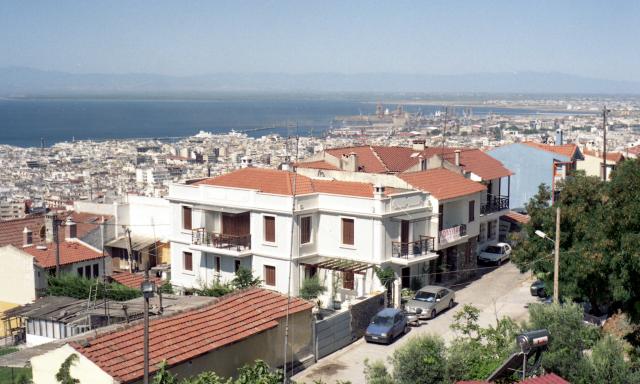 Start um 4:55 OZ bei 122 525 bzw. 1685 km. Tageskilometerzähler zurückgestellt. Die Fahrt durch das Peliongebirge gestaltet sich wieder langwierig (1 ½ h), dann geht es zügig weiter über Volos, Larissa, Katerini bis Thessaloniki (Maut 12,10€). Unterwegs an einer Autobahnraststätte Frühstück (3 Espresso 2 Zimtschnecken 8,70). - Um 10:15 (30° C) erreichen wir Thessaloniki. - Was man hier absolut nicht findet ist ein Parkplatz. Die Autos stehen in Zweier- oft sogar in Dreierreihen nebeneinander auf den Straßen. Dieses Übel ist sogar im Griechenlandführer ausdrücklich erwähnt. „… der eigene Wagen bleibt auf jeden Fall besser dort stehen, wo man mit Glück einen Parkplatz gefunden hat.“ - Wie es sich auch auf anderen Reisen in Städten bewährt hat, machen wir zunächst eine Orientierungsrundfahrt bis hinauf zum mauerumgrenzten und turmbewehrten Kastro-Viertel. Hier finden wir sofort – einen schattigen Parkplatz! Fotos vom Trigonio-Turm hinunter auf die Stadt und das Meer. Durch ein Stadttor gelangen wir in das Innere und erfrischen uns zunächst einmal unter einer weit ausladenden Platane mit Kaffee und Sodazitron. (6,--). Mit einem erworbenen Stadtplan schaffen wir uns einen ersten Überblick und begeben uns auf Hotelsuche.