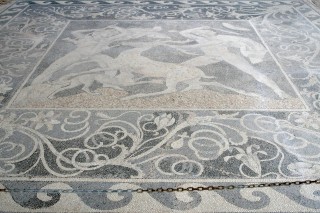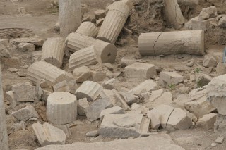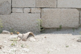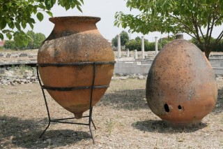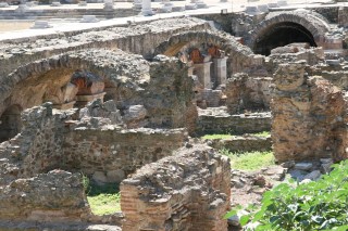 Fast schon auf einem Feldweg, der ins Nirgendwo zu führen scheint gelangen wir zur den Ausgrabungen. Bäume, ein kleines Standl, wo wir uns in den Schatten retten und laben (Bier, Kaffee 3,-- €). Trotz fast unerträglicher Mittagshitze besichtigen wir die Grabungsstätte. (Eintritt pro Person 6,-- € inklusive Museumsticket im Ort) Archäologen und Arbeiter sind am Werk. Besonders beeindruckend sind die Bodenmosaike aus farbigen Kieselsteinen (Entführung der Helena), verblüffend die teilweise noch in der Erde steckenden Fragmente von Tongefäßen. Anscheinend gibt es hier so viele davon, dass man sie gar nicht ganz ausgräbt. Wir wollen jetzt nur noch eines: ein Zimmer mit Klimaanlage und ausruhen. Das finden wir wenige km westlich im Hotel Istron um 50,-- € inkl. Frühstück. Duschen, Toast, 2 gr. Salate, 2 Bier (9,-- €) und Ruhepause.