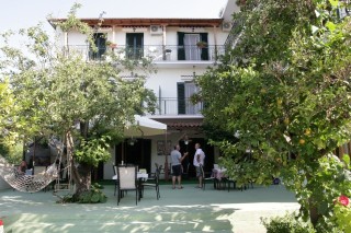 Dann lang, lang, auf- und abwärts auf engen gewundenen Staßen durch das sonnendurchglühte, von abertausenden Oliven bestandne Peliongebirge bis nach Platanias am Südende der Halbinsel. Hier geht es nicht mehr weiter. Straße zu Ende. Vor uns nur mehr das Meer. Wir parken und schauen uns um. Der Ort wirkt wie in sommerlicher Lethargie versunken – in Hitze erstarrt, aber trotzdem einladend zum Verweilen. Jetzt brauchen wir nur noch ein kühles Zimmer! Der erste Versuch scheitert an der Ablehnung der Vermieter uns ein Zimmer im Parterre anstatt (unklimatisiert) im ersten Stock zu geben. Wir gehen noch ein paar Schritte und kommen zu Hotel „Des Roses“ – „Ton Rodon“. Die Wirtin ist sehr freundlich. Zimmer? – Ja. Für wie lange? 2 bis 3 Tage. ok. Wir besichtigen das Zimmer. Groß, hell, freundlich, sauber, Doppelbett, Balkon, Klimaanlage, kleiner Küchenblock mit Kühlschrank; 40,-- € mit Frühstück. Wir sind da.
