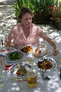 Mittagessen (Huhn mit Ockra, Zuchinisalat, Rndfl in Tomatensuace, gr. Salat, Bier, Retsina – 26,-- Melone aufs Haus). Wir sind praktisch dauerndunter Griechen. Es gibt hier wohl auch Deutsche und Österreicher aber man trifft sie nicht. Wir kaufen noch Obst und sind um 16:00 wieder im Zimmer. Hier lesen und ruhen wir, bis wir uns wieder dem abendlichen Vergnügen hingeben. Viel zu wenig Lesestoff!