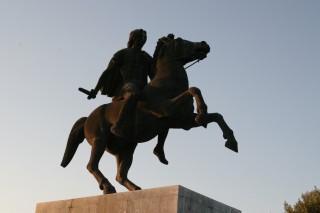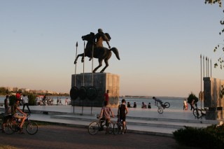 Auf einem großen freien Platz befindet sich eine mindestens lebensgroße Bronzestatue von Alexander zu Pferd. Jugendliche mit Rädern und Skateboards zeigen ihre akrobatischen Fertigkeiten. Den Bus um 21:00 haben wir für uns allein (2,-- € pro Person und Tag). Leider ist es schon dämmrig, später dunkel geworden, sodass wir die via Band, Videoscreen und durch persönliche Erläuterungen der Busbegleiterin erklärten Gebäude und Plätze nicht mehr deutlich sehen können. Die einstündige Fahrt führt bis in die Oberstadt. Bei der Rückfahrt durch die kurvigen und engen Straßen wird uns fast schlecht. Wir verlassen den Bus bei der „Rotonda“ und irren zurück in unsere Hotel-Gegend.