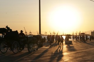Nachdem wir uns in unserem Zimmer eingerichtet haben, plagt uns der Hunger. Wir machen einen Spaziergang bis zur Hafenpromenade und finden dann im Marktbereich ein weinrankenbeschattetes Lokal. Ein sehr eifriger Kellner aquiriert eifrig Gäste und bittet uns an einen Tisch. (gebr. Sardinen, Shef-Salat, Bier). Hier gibt es Bettler, viele Straßenverkäufer – meist Schwarze - und Musikanten. Ein Gitarrenspieler zaubert auf seinem Instrument sirtakiartige Klänge, ein Gruppe behuteter Südamerikaner zieht musizierend durch die engen Gassen des ausgedehnten Marktgeländes und hofft auf Spenden. Wir gehen zurück und ruhen. Um 21:00 Uhr wollen wir mit dem letzten der im Stundenrhythmus verkehrenden Busse („hop on-hop off“) ein Rundfahrt machen, um die Lage der wichtigsten Besichtigungspunkte zu erkunden. - Überpünktlich finden wir uns bei der Abfahrtsstelle am Weißen Turm ein. Eine große Menge Jugendlicher hat hier das weitläufige Parkgelände am Ufer als Campigplatz „umfunktioniert“, um gegen irgendetwas zu demonstrieren.