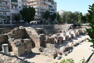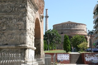 Frühstücksbüffet (um eine Säule herum angeordnet) mit allem, was man sich wünschen kann. Wir begeben uns auf Besichtigungstour und beginnen in unmittelbarer Nähe des Hotels mit der Kirche des Schutzpatron Agios Dimitrios aus dem 5. Jh. – die größte Kirche der Stadt; War während der türk. Besatzungszeit zur Mosche umfunktioniert. Dimitrios wurde hier in der Krypta begraben (zur Zeit v. Galerius).