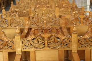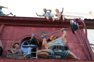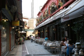 Beim Weitergehen durch die Märkte und auf der suche nach einer „Futterstelle“ erregt eine enge Gasse (ODOS KARIPI) unsere besondere Aufmerksamkeit: Entlang der Unterkanten der Dächer als Fries, manchmal auch oberhalb der Dachrinnen, sind lebensgroße Figuren angebracht, die verschiedene Szenen aus dem vorvorigen Jh. darstellen (Gaukler mit Tanzbär, …) Im „Schanigarten“ eines der Lokale (Oyzoy Melathron), das auch im Inneren über und über mit altem Krimskrams dekoriert ist, beschließen wir zu essen. Die doppelseitige Speisekarte ist über einen Meter lang und kaum zu handeln, als Brotkörberl werden Strohhüte mit schwarzem Band auf die Tische gestellt. Gerichte mit arab. Touch werden angeboten. Wir bestellen Tsaziki (ausgezeichnet!) Pie Arabia, Schweinskotl. (gebracht werden drei auf einem Brotfladen angerichtet), Tomaten-Gurkensalat, Bier, Soda, Wein (36,-- €). Die Portionen sind gigantisch und daher nicht zu bewältigen. Wir lassen jeweils die halbe Portion über und – werden wegen unserer essunwilligkeit sofort bestraft. Man bringt uns - nachdem wir beteuert haben, alles sei sehr gut, aber viel zu viel - nicht eine Nachspeise aufs Haus, nein, eine nach der anderen! Zuerst einen Joghurtpudding mit Himbeesauce dann - als wir schon aufstehen wollen - eine Platte mit 9 Knödeln in der Art gebackener Mäuse, überzogen mit Nougatsauce, bestreut mit Pinienkernen. Wir sind erledigt. Nach 10 Stunden kehren wir wieder in unser Hotel zurück, packen alles für die morgige Abreise und unternehmen gar nichts mehr. Thessaloniki hat uns geschafft. - Diese Stadt wird von den Touristen nicht richtig gewürdigt, da sie keine Altertümer aus der klass. griech. Antike aufzuweisen hat. Der Wandel in der Zusammensetzung der Stadbevölkerun im Laufe der Geschichte wird durch die vielen Sehenswürdigkeiten erkennbar.Es ist eine überraschend grüne, unglaublich lebendige Stadt mit vielen verschiedenen Gesichtern und absolut einen mehrtägigen Aufenthalt wert. Wir waren sehr positiv überrascht.