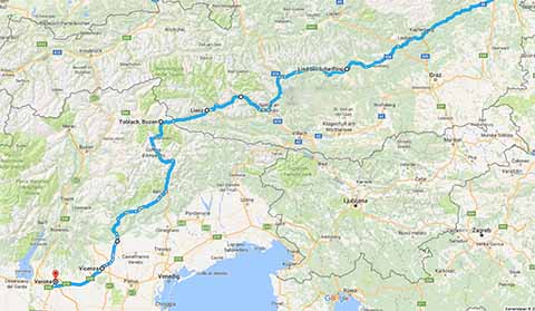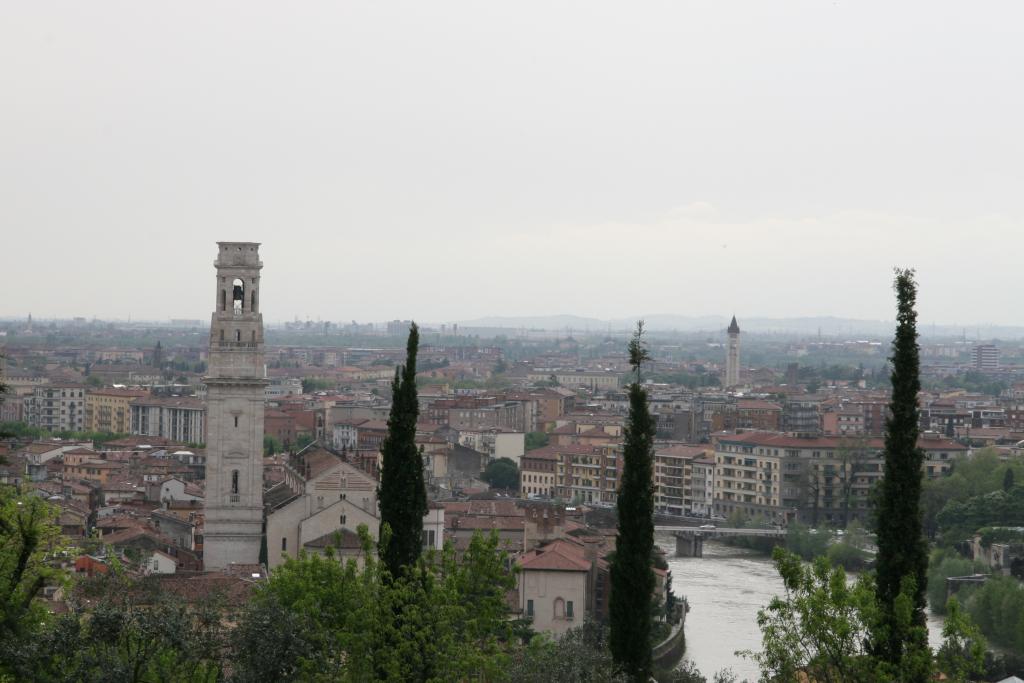 Mit Umwegen auf den Monte Berici, den Hügel, von dem aus man eine schöne Aussicht auf Vicenza hat. Am Weg dorthin die "Rotunda" gesehen und photographiert. Über Strade Statale (so heißt die Abkürzung "SS" glaube ich und sie entsprechen unseren Bundesstraßen) nach Verona. Gegend scheußlich zersiedelt und voller Industrieruinen. In Verona schöner aber steiler und enger Campingplatz hinter dem Castel San Pietro.