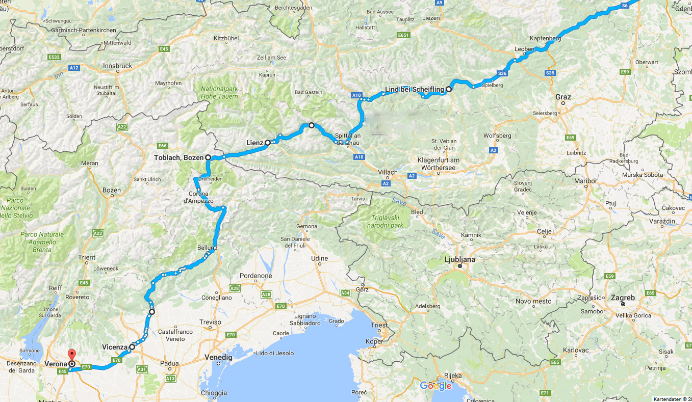 Rückreise. Angenehme Fahrt über die Autobahn Padua, Venedig, Udine; netter als auf den Landstraßen, da man mehr durch’s Grüne fährt und nichts von der zersiedelten, verschandelten Gegend sieht. 24 eur Autobahngebühr – geht so. Das Mittagessen in Tarvis wird dann eher nicht so gut. Wir habe keinen guten Platz, auf der Speisekarte ist nichts, was uns zusagt. Wir essen dann doch etwas, gehen aber sehr unzufrieden weg. Der nächste Halt auf einer österr. Autobahnraststätte ist dagegen 'Wonne und Waschtrog'. Die weitere Fahrt gestaltet sich eher entspann – außer dass ich mich darauf versteife erst zu tanken, wenn die Treibstoffpreise wieder österr. Niveau erreich. Direkt nach der Grenze sind sie nämlich so hoch wie in Italien. Das dauert aber. Nach der Abfahrt Richtung Zeltweg, über den Obdacher Sattel könne wir zum Glück in St. Leonhard tanken – puhh! Das war knapp. Diese Strecke ist übrigens sehr schön.