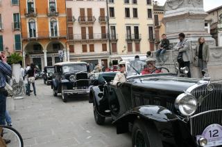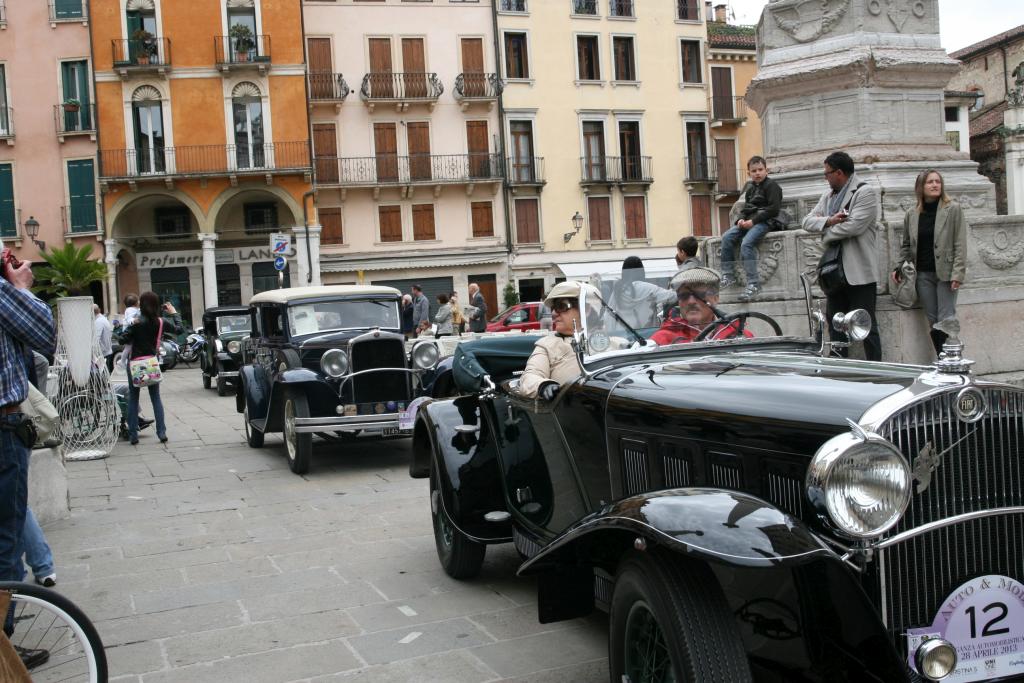 Sehr feuchter, schwüler Morgen. Ein Hahn kräht seit Stunden. Fahren weiter über Castelfranco di Veneto nach Vicenza. Finden einen Platz in der Kurzparkzone und es scheint, dass man da auch mit einem Wohnmobil stehen kann (1,20 pro Stunde auch an Samstagen, Sonn- und Feiertagen). Orientieren uns erst mühsam mit dem Stadtplan aus unserem Norditalien Führer (Grüner Michelin - eher nicht so empfehlenswert). Wir sind eigentlich schon im Zentrum! Beginnen unseren Rundgang mit dem Theatro Olympico, das wie so vieles hier von Palladio gebaut wurde. Vicenza und das Veneto ist die Heimat Andrea Palladios des legendären Renaissance-Architekten (-->Link zum Wikipedia Artikel über Palladio) und der wird hier auch weidlich ausgeschlachtet. Vom Theatro führt der Corso Palladio ins Innere der alten Stadt. Treffen auf eine Oldtimer Ralley mit sagenhaft schönen und gepflegten alten Autos (darunter auch ein Austin Healy - Brigittes Favorit - und kastenartige kleine, alte Limousinen, die mir so gut gefallen). Die Ralley hat so wie wir die Piazza dei Signori zum Ziel, den Hauptplatz der Stadt, der aus dem alten Forum Romanum hervorgegangen ist und so wie dieses einst eine langgezogene, rechteckige Form hat. Dort steht auch die Basilika Palladiana, eine Umbauung des ursprünglichen Pallazzo Communale. Das weiße Gebäude ist hoch, wuchtig, zugleich elegant, mit einem mächtigen grünspanigem Kupferdach wie ein umgedrehter Schiffsrumpf und dominiert die Stadt aus der Nähe wie aus der Ferne. - Wir ziehen noch eine weite Runde durch die Altstadt vorbei an zahlreichen Bauten aus dem Mittelalter und der Renaissance. - Zurück beim Auto werfen wir nochmals Geld in den Parkscheinautomaten und machen uns auf die Suche nach einem Restaurant. Es ist inzwischen sonnig und warm geworden und so wie wir suchen viele nach einem Essplatz. Werden in einem recht gestylten kleinem Ding fündig, leider nur mehr drinnen, wo am hintersten Tische eine Blase Schweizer trohnt, die mir mit ihrem übertriebenen Züridütsch auf die Nerven geht (Markezeichen g'stopfte Pseudo-Alternative, die sich volkstümlich geben). Brigitte nimmt etwas mit Rindfleischstreifen, ich eine Pizza - beides sehr gut. Nachdem ich Brigittes Reste auch noch wegputzen "musste" bin ich zum Platzen. - Schleppen uns zum Auto zurück, Zwischenstopp in der Touristinfo, wo wir eine genau Wegbeschreibung zu dem nicht einfach zu findenden Campingplatz kriegen. Sehr schöner Campingplatz, sehr viel Platz, guter Baumbestand, reichlich Klos und Duschen, keine schöne Lage. Am Abend fängt es zu regnen an.