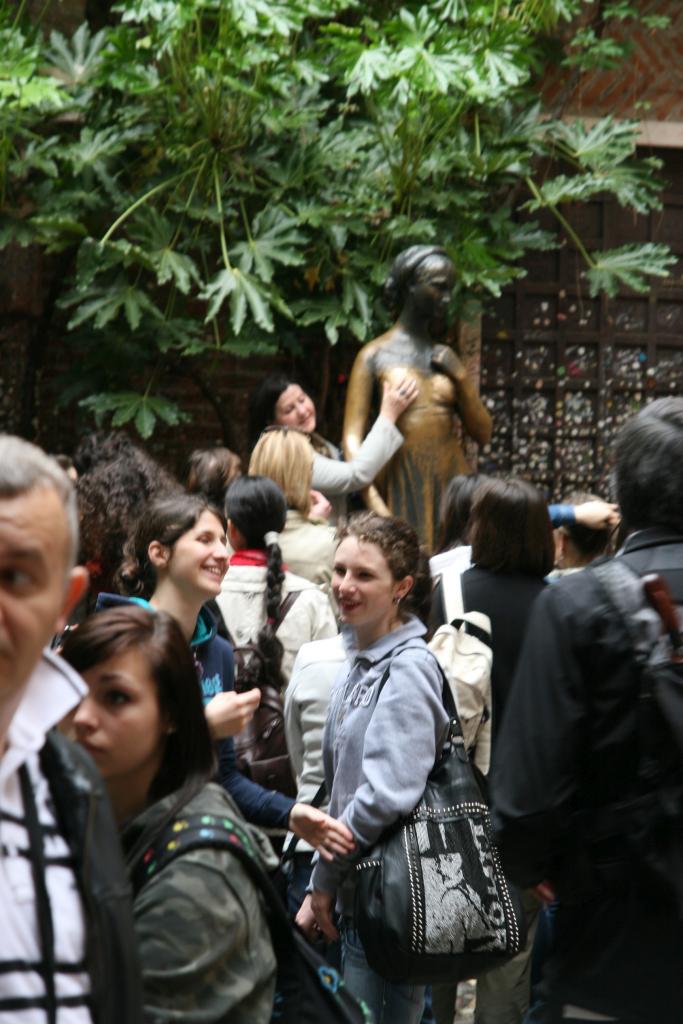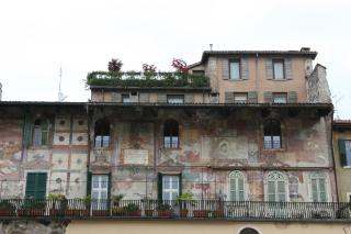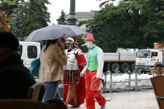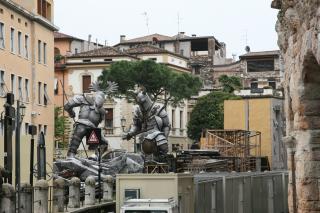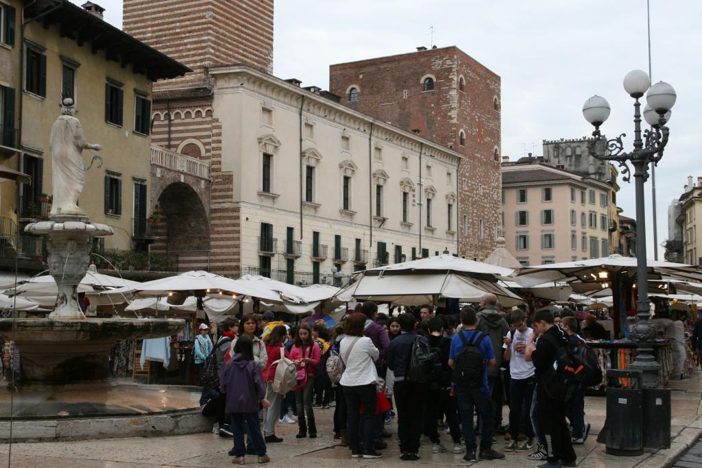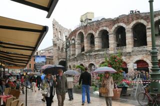 Besichtigung Verona. Sehr belebt. Viele Schulklassen. Es nieselt / regnet leicht. Kaufen uns einen zweiten Schirm (im Burburry Muster); der nette Mann im Schirm-Laden hilft Brigitte den Zipp-Verschluss ihrer Windbluse aufzukriegen. Am Hauptplatz Markt. Im Hof der (Romeo und ) Julia-Villa hunderte Menschen. Eigenartige Schaustellertruppe im Fakirs-Outfit mit "schwebender" Frau. Kaffee vor der Arena. Besichtigung der Arena bei Nieselregen. Mittagessen am Hauptplatz mit falsch zugeteiltem Essen, langem Warten und ein sensationellen Preis von über 50 Euro. Rangieren des Campingbusse; nette aber laute Gruppe als Nachbarn.