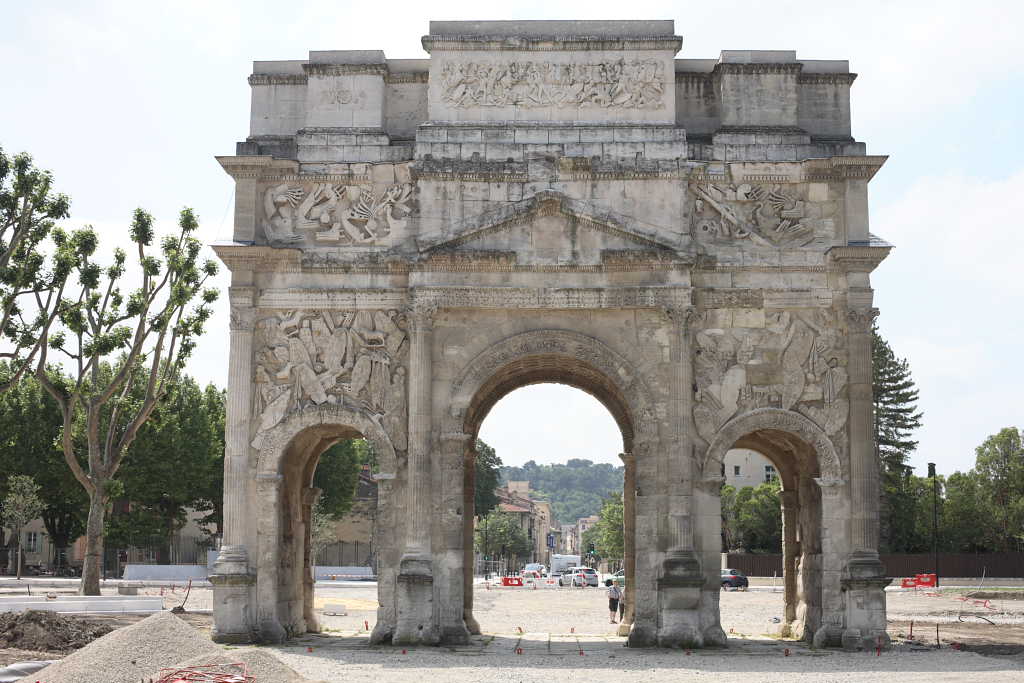 (11., Sa.3.6.) Ausflug nach Orange; nur ca. 25 km von hier über die N7. Von Pont St. Esprit, dort wo die Ardeche in die Rhone münde, überquert eine recht schmale Brücke die Rhone. - Orange ist sehr überschaubar. Man kommt am Stadtgründunsgbogen (sieht aus wie ein Triumphbogen) vorbei, umrundet das Stadtzentrum, findet sofort einen Parkplatz (Schock) und spaziert in die Fussgängerzone (= Altstadt). Ein paar Straßen weiter steht man vor dem alten römischen Theater (echt groß!). Nachdem man alles abfotografiert hat, sucht und findet man eine Bar zum Trinken. Man hat inzwischen rausgefunden, wie man den Pastis richtig trinkt, nämlich ohne Eis aber mit reichlich (für mich nicht zu kaltem) Wasser . Dann sucht und findet man eine Straße weiter einen Essplatz, wo man die Formule du Midi mit Thuneiern, Rindsfilet und Brasse nimmt, dazu Bier und Rose (das Dessert, Tarte aux Pommes und Mousse, war allerdings eher zum wegschmeissen), dann zieht man (trotzdem) befriedigt ab, um am Rückweg in einen Hypermarche einzufallen und sich mit Bier, Rose, diversen Esswaren und einem Wäschetrockenständer einzudecken, heimzufahren und erschöpft in die Campingsessel zu sinken. Warn echt guta Tag.