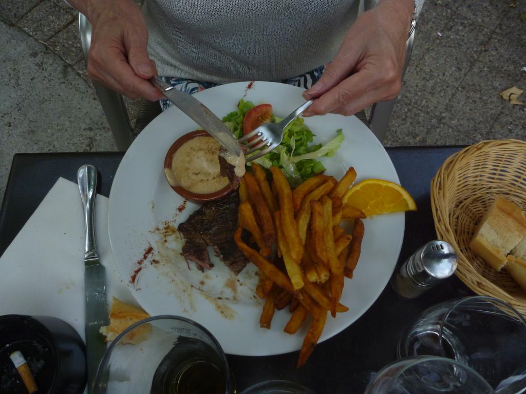 (8., Mi.31.5.) Heute nur ein kleiner Spaziergang durch St. Martin. Mittagessen am Ufer des Flusses; Brigitte einen Salade Champanarde (so ein Ding mit Hühnerstreifen drauf) und ich einen Baron d'Agneau. Was der "Baron" ist, krieg ich auch mit unseren offline-fähigen Reisdictionairs nicht raus (die sagen nur, dass ein "baron" ein "Baron" sei), aber es muss so eine Schnitte durchs ganze Lamme sein. Mürbteigkuchen mit Birne zum Abschluss, ziemlich gut alles. - "Daheim" ein bissl Wäsche waschen und ruhen. Es regnet heut 3x, dazwischen "sticht" die Sonne, aber insgesamt ein ruhiger, angenehmer Tag. Haben heute Nacht die Verbindung der zwei Einzebetten reingetan; mühsames Gewurschtel, gibt ein riesiges, fast 2x2 m großes Bett. Der Wohnwagen wirkt aus der Liegeperspektive innen echt groß. Mit Mama telefoniert. Von Felix gehört, der sich die Schulter ausgerenkt hat.