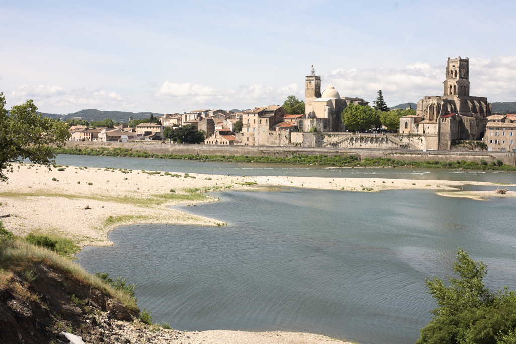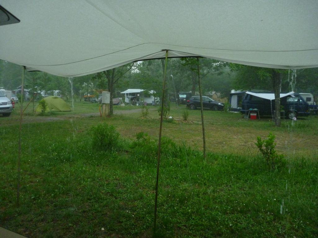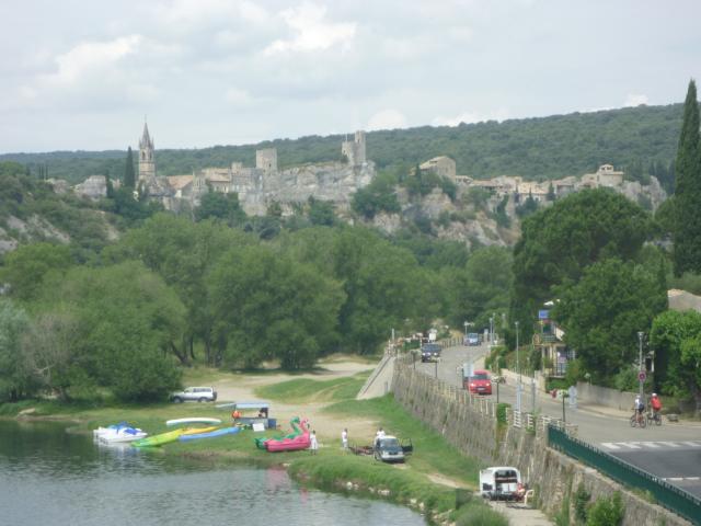 (12., So.4.6.) Gestern noch ein wahnsinns Gewitter mit sintflutartigem Regen; gemütlich im Wohnwagen. Heute eigentlich ein Ruhetag. Machen einen kleinen Ausflug nach Pont St. Esprit, wo die Ardeche in die Rhone mündet. Die Stadt gibt ein tolles Bild, wenn man über die Rhone hinweg ihre Silhouette betrachtet. Aus der Nähe ist sie schmutzig und verkommen. - Bei der Rückkunft stellen wir fest, dass der Wind unser Vordach von den Stangen gerissen hat; an zwei Stellen ist der Stoff neben den Verstärkungen und Ösen eingerissen; bin wirklich sehr verärgert über mich selbst, dass ich es nicht abgebaut habe. B. bereitet zum Trost ein top Mittagessen, Serrano-Schinken mit Melone, Brathuhn (verbessertes fertiges aus dem Supermarkt), Petersilerdäpfel, Salat, Erdbeer- und Himbeertörtchen (vom Bäcker), Tarte aux Pommes (echt selber gemacht, aus der Pfanne). - Planung für die nächsten Tage: