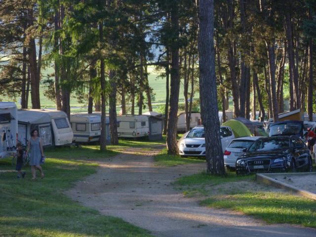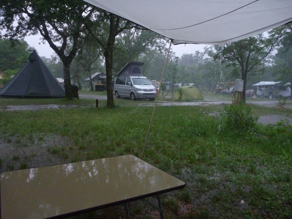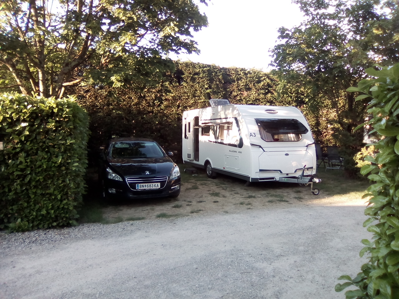 (4.Tag, Sa.27.) Von Orb (CH) nach St.-Julien-en-St.-Alban am Fluss Ouveze, auf den Campingplatz "l'Albanou" etwa 30 km nach Valence (F) auf der Straße nach Privas. - Heute hatte es über 30° - scheißheiß; war mühsam, die Sonne hat den ganzen Tag von vorne ins Fenster reingeknallt. Die Klima kann das gar nicht. Weiße Tücher am Amaturenbrett haben auch nicht viel geholfen. Der Platz ist schön, nicht weit von einem kleinen Fluß, aber es ist jetzt um 19h immer noch zu warm. Einparken ging ganz gut, obwohl der Platz (für mich) ziemlich eng ist. Ein netter Holländer von vis-a-vis hat mir geholfen den WW grad zu stellen. Die haben seit 30 J. einen Caravan und dz. einen (kleinen aber noblen) Hobby Premium, den sie mit eine Audi A6 ziehen. Der Platz ist ein ACSI Platz und wir haben günstige 18,50 gezahlt. Sollte WLAN haben, aber dieses hier hat genau 0 Reichweite. Kriege mit Handy schwer, mit Tablet gar keine Verbindung. Upload Reisetagebuch muss warten.