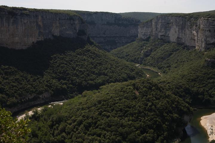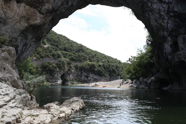 (7., Di.30.) Ausflug in die "Gorge d'Ardeche", die Schlucht der Ardeche. Höher, steiler, tiefer - sie ist beeindruckender als ich es mir vorgestellt hatte. Bei Vallon Pont d'Arc gibt es einen Felsbogen, der sich über den Fluss spannt. Auf dem Rückweg ein sehr französische Mittagessen in St. Remez. Salat mit Rote Rüben in einer Sauce Pistou (?), Kaninchen mit Reis und Letscho, Ananas-Carpacchio, Kaffee und Armagnac. - Bis ca. 2 waren die Temperaturen angenehm um die 25°, danach geht's auf 29°. Letzter Tag der ersten Woche; wenn ich das vom Chiemsee und München nachlese, kommt's mir schon lang vor.