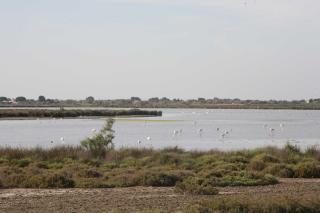 (17., Fr.9.6.) Gestern abend war es dann schön kühl - gut zum Schlafen. Spät auf, Baguette und Croissants (man muss sie hier nicht vorbestellen), Mittgessen im Ort, Thunfischsalat, Spagetti mit Meeresfrüchten. Der Ort besteht nur aus Restaurants und Touristenläden; starker spanischer Einfluss, Churros, Paella, Wahrsagerin in Flamencokostüm, Schuhe Made in Spain - ein bissl seltsam. Es gibt einen Yachthafen. Die Küste ist mit T-förmigen Felsdämmen geschützt (um zu verhindern, dass sie wegerrodiert?). - Abends raus aus dem CP und zu dem Marschland, wo die Flamingos steh'n; sind zu weit weg zum fotografieren.