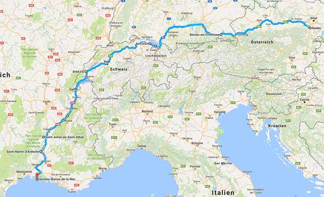 (Mi.24.) . . . ist das geplante Datum für die Abreise. Geplante Route: Salzburg - Chiemsee (ggf. 1. Übernachtung) - München - Memmingen - Lindau/Bodensee - Hefenhofen/Amriswil (ev. 2. Übernachtung) - Genf - Neydens (3. Übernachtung) - Annecy - Chambery - Valence - Orange - Avignon . . . - bei dieser Teilung ist jede Tagesstrecke unter 400 km. Von Baden in die Provence sind es ca. 1400 km.