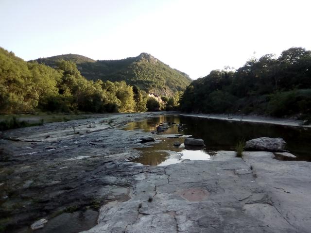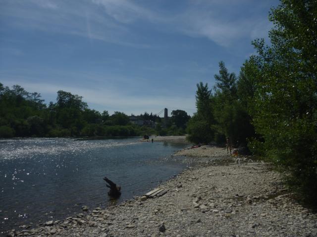 (5. Tag, So.28.) Von St.-Julien-en-St.-Alban nach St.-Martin d'Ardeche; nur 65 km. Wir sind von der Hitze der letzten 2 Tage ziemlich KO. Campingplatz Huttopia le Moulin (von Huttopia gibt eine ganze Reihe von Campingplätzen). Ein sehr geräumiger Platz mit angenehm große Stellplätzen. Es fällt uns trotzdem schwer, uns für einen Platz zu entscheiden. Die Frage ist, wo man die längste Zeit Schatten hat. Unser jetziger hat ein "Loch" von 14 bis 17 Uhr, dh. in der Zeit knallt die Sonne auf den Wohnwagen. Der CP liegt an der Ardeche; die ist hier durch den Rückstau von der Rhone schon breit und tief.