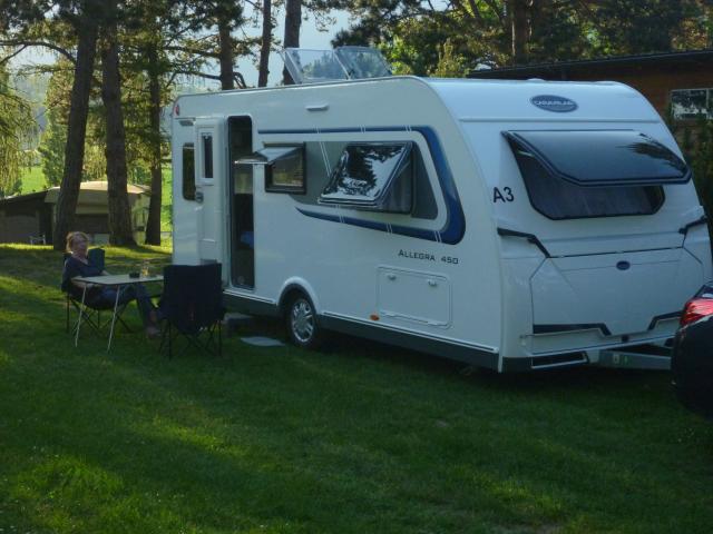 (Mo.22.) Wohnwagen von Pusch Altlengbach geholt; ein Caravelair Allegra 450 (7m Gesamtlänge, 1350 kg Maximalgewicht); er ist ganz neu, wir sind die ersten Mieter. Beginnen mit packen und laden.