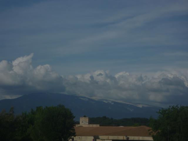 (15., Mi.7.6.) Nicht so gut momentan, B. Rückenschmerzen; hatte sie schon mal, die Tabletten von damals helfen nur zögerlich. - Ausflug nach SAULT. Das liegt 700 m hoch. Auf dem Weg dorthin fährt man auf der S-Seite des Mt. Ventoux entlang. Der ist eigentlich ziemlich "schiach", jedenfalls unspektakulär und nur interessant, weil er geschichtlich was bedeutet. Die Gegend ist ein Zentrum des Lavendelanbaus, aber der blüht noch nicht (zu hoch; bei Tarascon werden wir später auch blühenden sehen). Sault ist eine hübsche, pittoreske Stadt; heute ist Markt, das macht es noch interessanter. Kaufen ein sehr, sehr schönes Tischtuch und einen Teetopf-Untersetzer (Mitbringsel). Mittag in einer Kaffebar, Croque Monsieuer und Quiche Lorraine - jetz eher nicht so besonders. Am Rückweg Spar und Super-U, Bier, Milch, Wasser, etc. Heute wieder sehr windig. Brigitte findet die von hohen Hecken eingezäunten und von Platanen beschatteteten Stellplätze ein wenig düster (höflich gesagt).