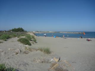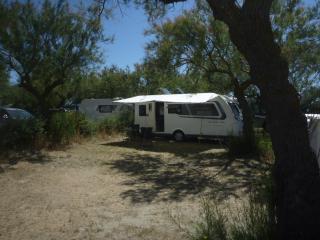(16., Do.8.6.) Planänderung! Statt nach Aix-en-Provence fahren wir nach Saintes-Maries-de-la-Mer, 40 km SSW-lich von Arles (in der Camargue; am Meer, wie der Name sagt). Aix kommt uns plötzlich nur wie eine Wiederholung vor und es zieht uns ans Meer. - Arles sieht bei der Durchfahrt sehr interessant aus. Brigitte war mit Wohnmobil und Familie schon hier; auf derselben Reise, die sie nach Arcachon gebracht hat. - Der Campingplatz ist sehr besucht :-( und hat jetzt nicht so viel Schatten :-( :-(, aber B. ganz begeistert vom Licht, von der Sonne, vom Meer, von den Tamarisken und vom Leben im Ort und auf dem CP ... na, dann ..