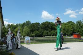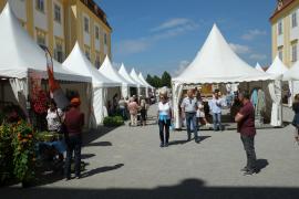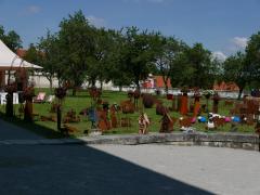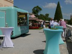 (Sa.1.6.) Schlösser Niederweiden und Hof. Niederweiden ist ein hübsches Barock- (Jagd-) Schloss. Von der Einrichtung ist nichts erhalten. Die Ausstellung über den Kaufhandel ist öd, gequält und (bis auf den nachgestellten Greißler) uninteressant. In einem separaten, niedrigen Gebäude waren die Küchen zu Zubereitung des Wildes untergebracht; eine erstaunliche Anzahl von Herden/Feuerstellen, schön hergerichtet, interessant und stimmig; kann man buchen. Ausstellung der sehr farbenfrohen Bilder des Malers Gottfried Laf Wurm (Laf?). - Schloss Hof ist grandios - hell, strahlend, weitläufig, großzügig, vielfältig, sehr Prinz-Eugen-isch. An diesem Tag fand auch noch eine Gartenausstellung statt; da waren schrecklich viel Leute. Inzwischen ist es heiß geworden. Als Mittagessen nehmen wir Standl-Imbisse im Schatten eines Baumes auf Heurigenbankerln ein. Brigitte (mangels Alternative) einen Voralpen-Bio-Burger, ich ein Curry-Gericht aus der Küche Sri Lankas, dazu Bio-Bier. Der Burger war so bio, dass er kein Bröserl Gewürz gesehen hat, daher nicht so ein Erfolg. Ich bin von der ungewohnten Hitze ziemlich schnell, ziemlich fertig und froh als wir "nach Hause" fahren. Auf dem Rückweg ein erfolgloser Versuch an die March zu kommen.