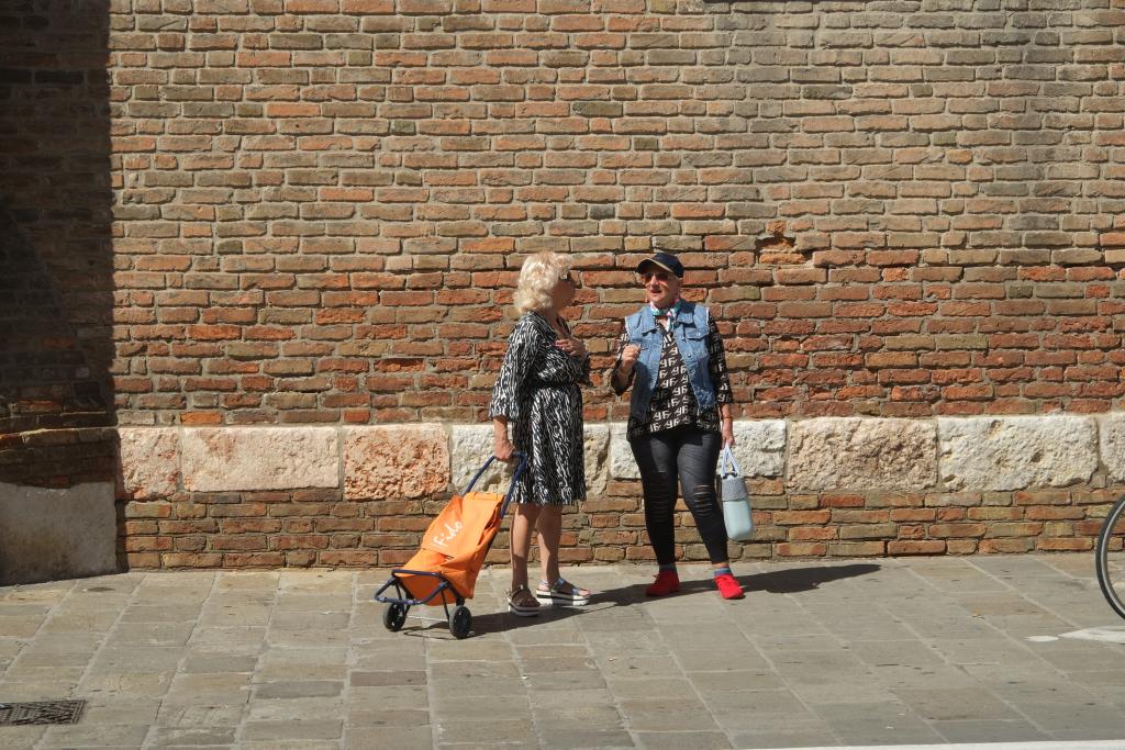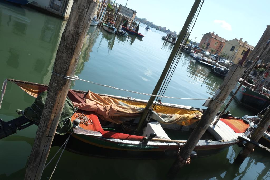 Chioggia 2. Besichtigungstag. Zwei Beobachtungen. Ein recht großes, offenes Boot mit Außenborder kommt den Kanal herein; im Schlepp ein zweites, auf dem Reußen oder etwas ähnliches geladen sind; wohlgemerkt, das zweite Boot wird nur geschleppt, kein Motor, keine Besatzung, es hängt halt mit einem Schnürl am ersten. Das fährt mit ziemlichen Schwung zwischen den anderen durch, peilt ein Lücke an, wo an zwei Pfosten Platz zum längsseits Gehen ist, bremst kurz ab und treibt auf die Pfosten zu, an denen es zur Ruhe kommt. Das zweite Boot treibt durch den Schwung in der Kurve seitlich etwas weg, stupst das erste genau dort an, wo ein Reifenfender hängt, dreht sich dadurch noch etwas mehr und Bug an Heck kommen beide Boote zur Ruhe, ohne dass einer der beiden im ersten Boot auch nur eine Hand gerührt hätte. Echt kuuhl das Manöver.