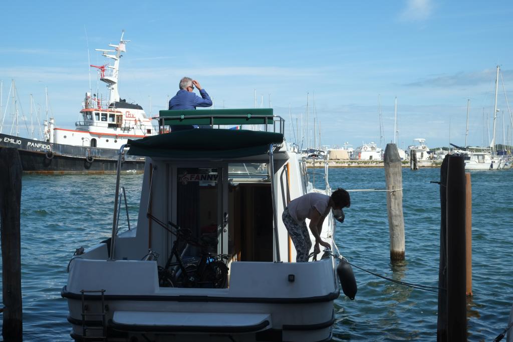 Vorne, also dort wo die Stadt Richtung Venedig schaut, gibt's auch Hausboote zu mieten. Muss nett sein in der geschützten Lagune rumzuschippern und vielleicht vor Torcello zu ankern und dort zu übernachten. Die kriegt man "ohne Patent"! Durch Zufall sehen wir ein Pärchen mit eine Italiener verhandeln, der ihnen anscheinend Anweisungen zum Ablegen gibt. Müssen Deutsche sein, Holländer, Engländer oder sowas. Beide schlank, er braun gebrannt, sportlich, drahtig, sie ein wenig bläßlich, eher soft um nicht zu sagen schlapp. Also, die Anweisungen des Italieners sind beendet, er begibt sich auf die "Brücke", das ist so ein Außensteuerstand am Dach, wo er sich in den bequemen Sessel knotzt und ... gar nix tut. Sie müssen ein eingespieltes Paar sein. Sie - saust zum ersten Festmacher, den richtigen übrigens, einem der beiden leeseitigen. Es steht nämlich ein ganz schöner Wind von der Seite ein. Dann zack, zack, zu nächsten. Jetzt würde es normalerweise ein bisschen schwieriger werden. Man müsst das Boot eigentlich ein Stück nach vorne verholen, oder den vorderen Festmacher auf Slip nehmen und zur Bootsmitte bringen. Solche elaborierten Maßnahmen sind allerdings nicht vorgesehen. Es wird die hintere windseitige Leine losgemacht, jetzt driftet das Heck natürlich weg, aber das steht eh ein großer dreibeiniger Poller und rund ums Boot läuft eine schöne dicke Gummileiste. Interessant wie erstaunt der Mann auf sein Hinterteil schaut und sich wundert. Dann wird der letzte Festmacher losgenommen, von der erstaunlich ergebenen und leinen-geschickten Dame, seine Erhabenheit der Kapitän haut ordentlich rein, will heißen, gibt ordentlich Gas und weg sin' sie.