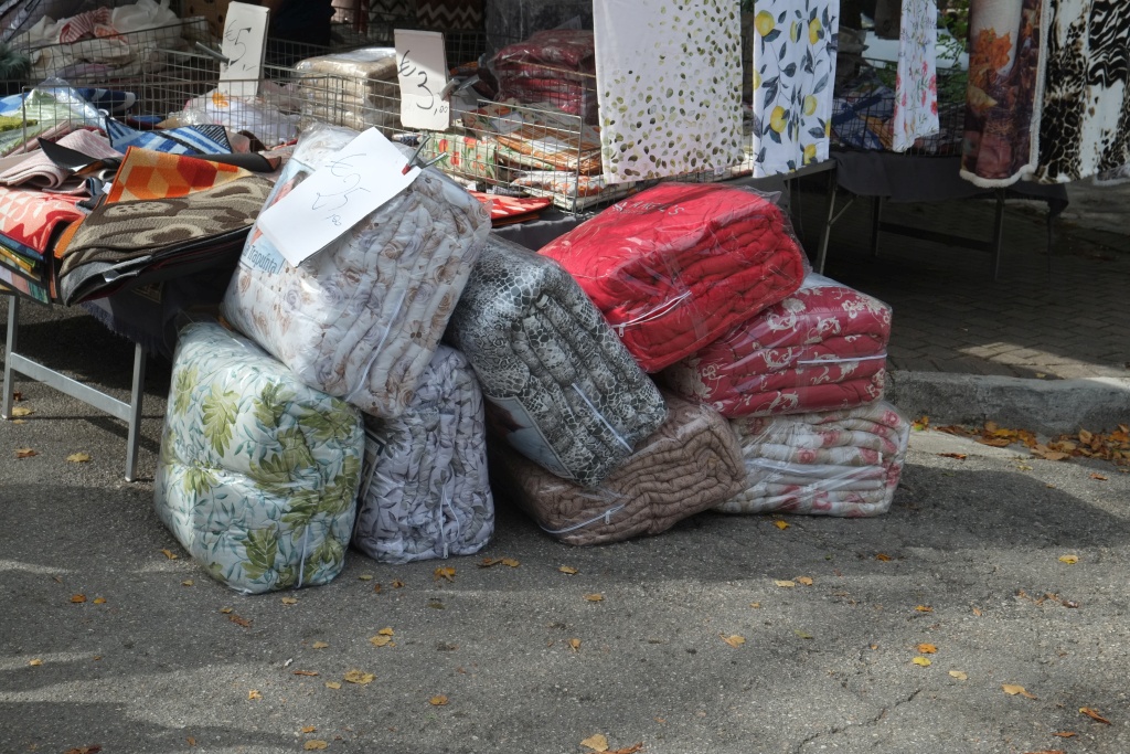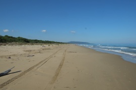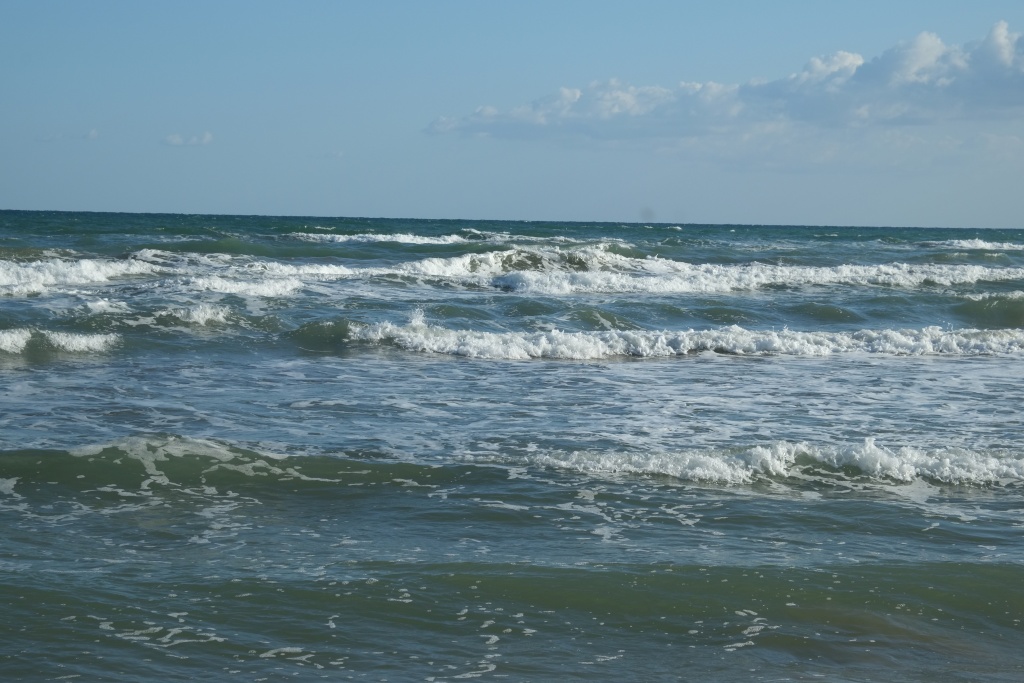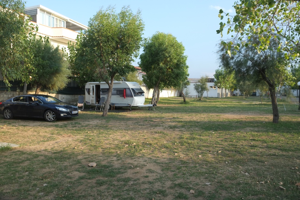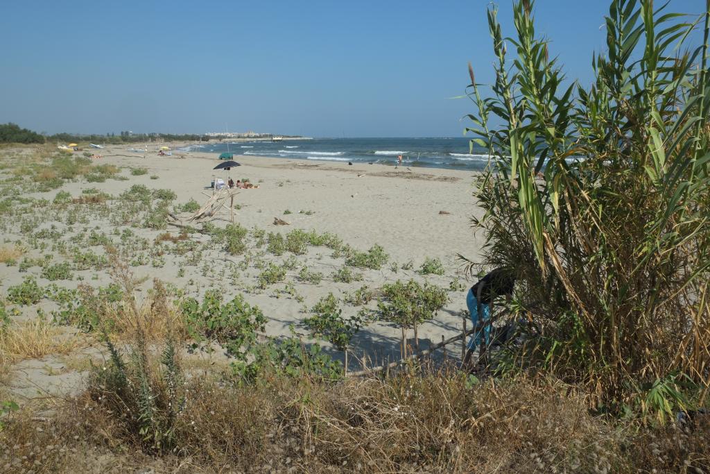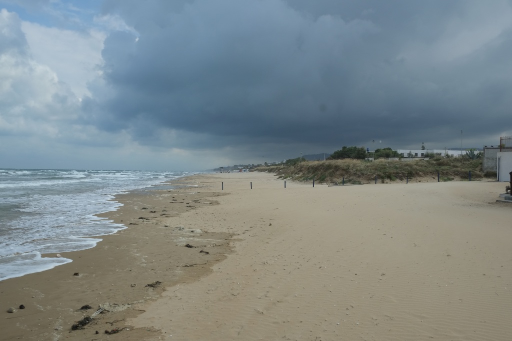 Spät am Abend mit zwei Deutschen geplaudert; deren Wetter-App sag, dass in der Nacht Gewitter kommen würden, es den ganzen Donnerstag regnen und dann wieder schön werden solle. - Stimmt jedenfalls dass mit Gewitter in der Nacht; mit heftigen Windböen; schauen ganz nervös auf unsere Markise, aber die hält bombenfest; echt gut diese sogennante Taschenmarkise aus einer dicken Kunststofffolie, gegen den WW verspreizt und mit zusätzlichen Spanngurten. Am Vormittag regents noch, heftig, gegen Mittag hört es auf. Gehen in den Ort. Puhh! Ist der tot, dreckig und verkommen! Muss vor 10 oder 20 Jahren aus dem Boden gestampft worden sein; die Gebäude sind bereits schäbig, die Geschäfte abgewandert, jetzt in der Nebensaison echt tot und leer. Sind die einzigen Gäste in einem Strandrestaurant. Dabei, der Strand, das Meer alles so schön! Allerdings gibt's einen super Supermarkt. Das Wasser in unserm Tank ist etwas schal geworden, hier finden wir einen Chlorzusatz, um den Tank durchzuspülen; Käse, Schinken, Bier, Brot, Salat, Zitronen sowieso. Es gäbe sogar Chemie für die Bordtoilette. - Mache am Nachmittag einen langen Strandspaziergang - wohltuend.