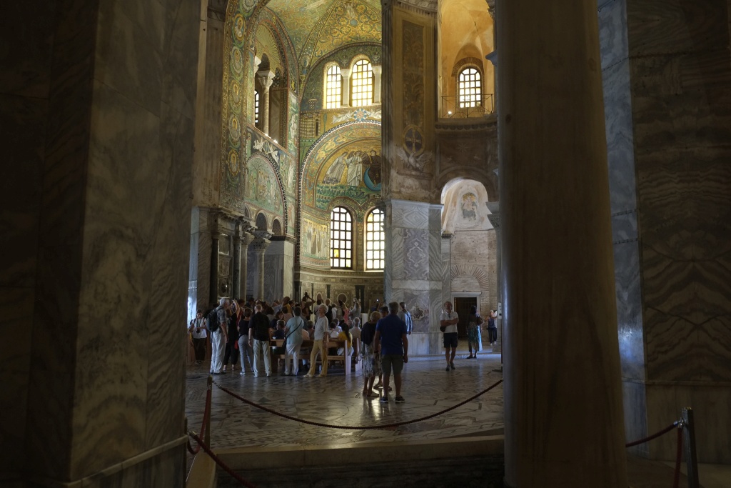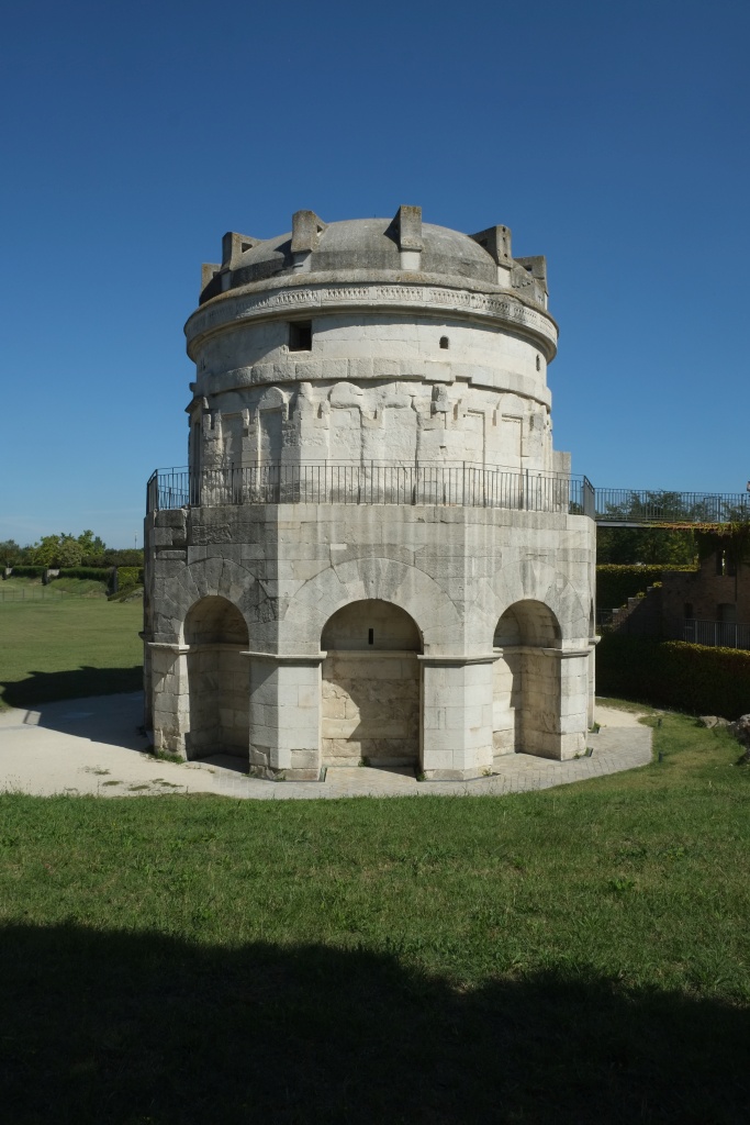 Zum Grabmal Theoderichs des Großen und zum Mausoleum der Galla Placidia; sie war ua. Regentin Westroms und starb kurz bevor Theoderich geboren wurde. Eigenartig wie anders das Leben Dietrichs von Bern in der Sage ist als das wirkliche des Theoderich. Das Besondere an dem Theoderich Grab ist die aus einem einzigen Stein gehauene Kuppel (11m, 1m dick). Das Mausoleum der Galla Placidia hat überragend schöne Mosaike; ebenso das Baptisterium der Orthodoxen. In Ravenna ist viel von der Mosaikkunst erhalten, die in Byzanz verloren ging. - Kleiner Mittagsimbiss (Risotto di Mare, Toast) in der Nähe. Einkauf auf der Rückfahrt. Nochmal die Wikipedia Einträge zu Theoderich, Odoaker und Galla Placidia gelesen - erstaunlich, wie sehr die mit der Völkerwanderung einfallenden Herrscher versuchten, das römische Reich aufrecht zu erhalten.