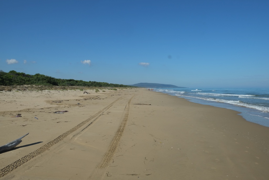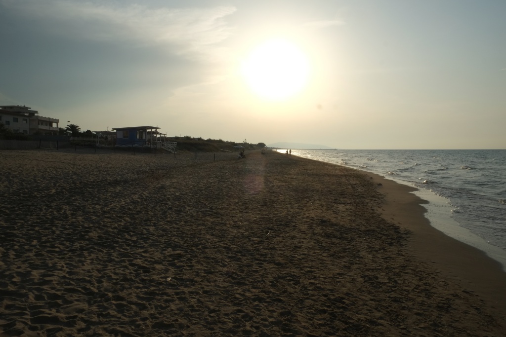 Von Recanati / Ancona nach Foce Varano auf den CP Perla di Gargano. Sind etwas über 300 km, den überwiegenden Teil der Strecke Autobahn (28€ Maut). Sobald wir auf die Landstraße auf den Gargano einbiegen, sieht alles ziemlich heruntergekommen aus; flach, dürr, magere Kühe auf der trockenen Weide, die Häuser schäbig, schon lange nicht neu angefärbelt. Die CP am Weg haben alle geschlossen; auch der, den wir uns als Halt vorgenommen haben; der nächste sollte bis Ende September auf haben, ist aber auch schon dicht. Dafür hat ein paar Km weiter einer auf - eben die Perle des Gargano. Ist ein bisschen vollmundig zwar, die Facilities nicht sooo super, aber sonst in Ordnung; ist angenehm leer, direkt an Strand. Der Strand! Feinsandig und flach verlaufend - is'n echt guta Strand. Man geht einfach durch ein Tor auf den Strand; man braucht keine Chipkarte, es ist nicht vorgeschrieben, wann man an den Strand gehen darf und wann nicht (wie seinerzeit in St. Maries de la Mer oder gestern in Recanati). Wahnsinn! - Bissl heiß heute; die Beine und Arme jucken uns. Wir starren uns gegenseitig auf unser roten Nasen; sind gerade sehr ruhig ...