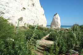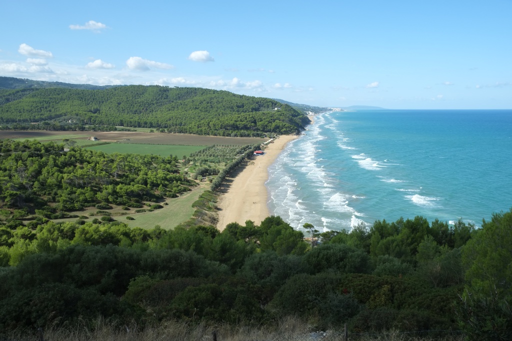 Wie himmlisch ist die Perle des Gargano! Drei andere Camper; wir müssen den Hals strecken und den Kopf drehen, um sie zu sehen; "Eigener" Strand; auch hier gibt's fest verankerte Schirme; ich glaube es sind drei. Jetzt, wo's frisch und windig ist, ist niemand dort - auf den sechs Kilometern Sandstrand, die wir überblicken, gehen ein paar Leut spazieren; das ist alles. Am ersten Tag, als es noch sonnig und warm war, waren etwa ein Dutzen in der näheren Umgebung (ich geb's ja zu, das ist mir auch zu viel, aber ich versuche bescheiden zu sein). Also - kein Verlegen des WW. Ausflüge von hier. Rodi (6 km) für Einkaufen und Essen.