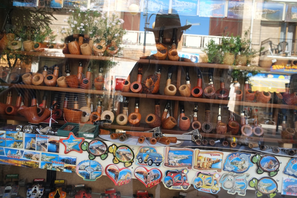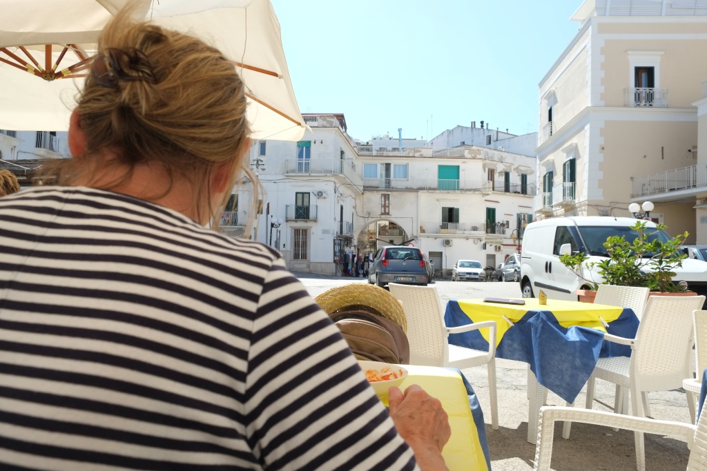 Fahren nach Peschici, 16 km, und Vieste, 45 km. Sehr kurvige, schmale Straßen. Wollen einerseits diese beiden Orte besichtigen und auch einige CP anschauen, ob wir uns eventuell dorthin verlegen wollen. Das nächste Dorf, Rodi del Gargano, erweist sich als ebenso häßlich wie lebensvoll. Peschici liegt steil auf einer Felsenklippe; ein Ort, der sich mehr in der Senkrechten entwickelt; auch sehr atmosphärisch. Vieste ist etwas ruhiger, auch steil, aber nicht ganz so wie Peschici. Dort essen wir; ganz gut, richtig italienisch, also Basta als Vorspeise, Fisch, Kotellet, Salat, dazu Bier und due quarti di vino bianco. - Für die Rückfahrt gibt es teilweise Strecken inland und nicht wie bei der Herfahrt auf der "Litoreana". Ist aber auch nicht viel weniger kurvig. Ziemlich KO bis wir in Foce Varano ankommen. - Haben auf dem Weg drei CP besichtigt. Holyday und Baia di Lombardi sind schön, beschattet, am Meer gelegen und haben bis Anfang oder Mitte Oktober offen- Sie liegen vor Vieste und daher zentraler im Gargano als unsere "Perla". Allerdings sind sie viel "gefüllter". Was mich wie immer zum Wahnsinn treibt ist, wie sich dieser Camper zusammenschoppen; als ob sie am liebsten mit ihren Hinterteilen in die Eingeweide ihrer Nachbarn kröchen. Es ist widerlich! Nur um sich der Illusion hinzugeben, sie hätten eine Platz am Meer, schieben sie sich in zwei Reihen so eng zusammen, dass man kaum mehr zwischen den Gehäusen durch kommt. Ich hatte immer gedacht, das unangenehmste am Campen seien die gemeinsamen Toiletten, aber das ist gar nix verglichen mit dem peinlichen Fehlen des Distanzverhaltens! - Das gute von diesen speziellen Camperinstinkten ist, dass dort wo keine der beiden vordergründigsten Begehrlichkeiten(* befriedigt werden . . . Platz bleibt!