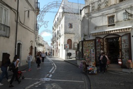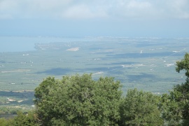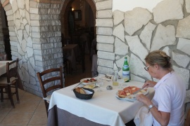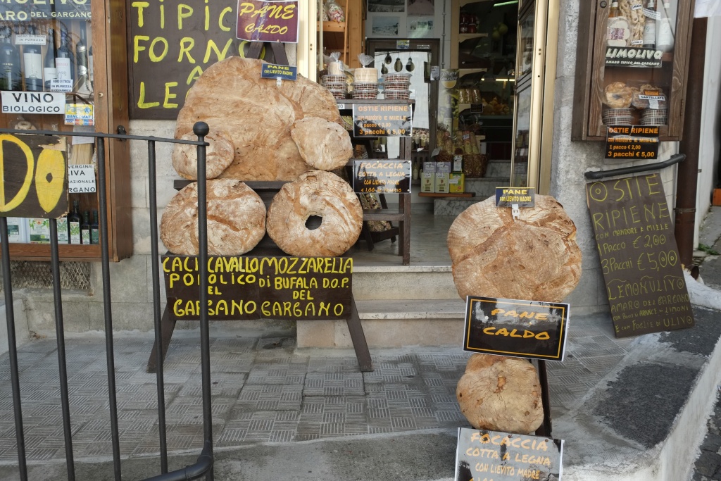 Ausflug nach Monte San Angelo. Über eine etwas längere Strecke, über San Giovanni Rotondo, hin, weil sie auf der Karte weniger kurvig aussieht. Man durchquert dabei den Naturpark des Gargano. Dichte feuchte Wälder mit teilweise alten, großen Bäumen. Wilder Oregano, der ziemlich scharf würzt. Sensationell! - Monte San Angelo ist eher bizarr. Steiler Ort, ein paar gar nicht so alt aussehende kirchliche Gebäude und sonst nur Kitschläden. Finden einen guten Essplatz mit Terrasse und Blick über die Stadt. Es gibt "tipico regionale" Speisen. Schwer zu beschreiben, aber gut. Am Rückweg in das Heiligtum. Der Monte ist dem Erzengel Michael gewidmet, so wie Mont St. Michele in der Bretagne und St. Michaels Mount in Cornwall. Gibt natürlich schon Mistery-Krimis darüber. Man geht viele Treppen runter und landet in einer Grotte. Dort zelebriert gerade ein deutsch sprechender Priester; seine Stimme wird mit Lautsprecher überall hin in dem Gebäude übertragen - Gold und Glitzer, Andacht und Stille - sehr atmosphärisch das ganze. Obwohl ich sehr definitiv nicht religiös bin, mag ich Orte mit meditativer Ausstrahlung - und diese Grotte gibt was her :-). Zurück auf die Nordseite des Gargano, zu unserem CP über die kürzere, kurvige Straße. Auch hier tolle Wälder, aber die andere Strecke war besser. - In der Nacht Sturmböen und Wetterleuchten. Der Wind wird so stark, dass wir die Markise abbauen. Wär nicht nötig gewesen, sobald wir sie abgebaut haben, lässt er nach. (1. Bild: Lago Varano 'von oben'.)