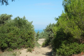 Ruhe- und Waschtag in Foce Varano. Mittags Tortelloni und Schinken mit Ei. Strahlender Tag, Luft klar, man sieht mehr von den Tremiti Inseln. Segelboot mit dem Fernglas beobachtet, Fock und Besan als Stützsegel, mit Motor gegenan, wahsinn, wie's die rauf- und runter haut. Langer Strandspaziergang bis zu einem Kanal mit Hafenmauern und Leuchtfeuer, der den Lago Varano mit dem Meer verbindet.