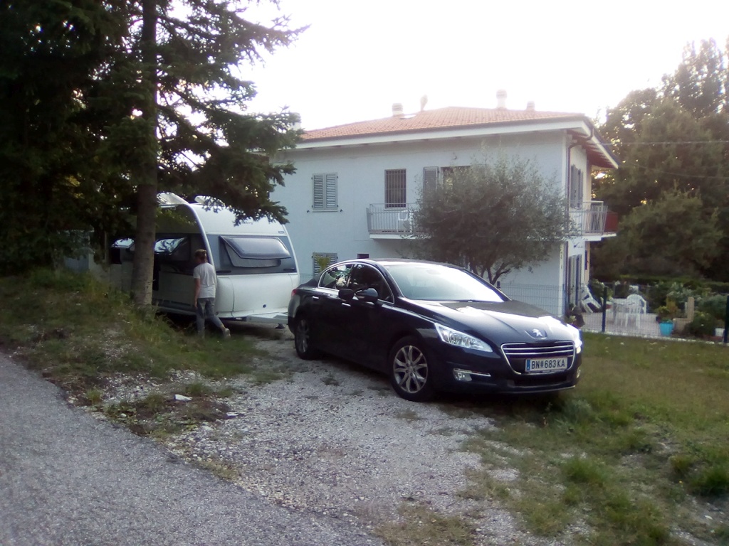 Vom Gargano nach Urbino. Mein "Here we go" offline Navi hat 310 km ausgerechnet. In Wirklichkeit sind's 430. Am CP sollen wir nur für eine Nacht unterkommen. Der Platz wird nämlich geschlossen, und zwar entgültig aufgelassen. Der Eigentümer ließ sich sich auch mit Bitten und Überreden nicht dazu bewegen, uns zwei Nächte da zu lassen! Die eine Übernachtung hätte 35 gekostet und wir hätten nächsten Tag bis 11 abfahren müssen. Das veranlasst Brigitte die Nachbar abzuklappern und zu fragen, ob wir privat wo stehen könnten. Erfolgreich! Nach einem komplizierten Einparkmanöver stehn wir auf einer kleinen Wiese zwischen Straße und einem Haus. Mr. CP Pineta Urbino kriegt gar nix. Als ich ihn um etwas Wasser frage, macht er ein Gesicht, sodass ich gleich wieder abziehe. Das Wasser kriegen wir auch privat. Tatsächlich kriegen wir von unseren Nachbar am Sonntag auch noch ein Frühstück (nach dem wir uns mit ein paar Flaschen Wein bedankt hatten). Was bei dem autarken Kampieren am ehesten problematisch ist (weit mehr als der fehlende Strom), ist die Sache mit dem Klo. Man hat ja ein Bord-WC, aber ich werde ziemlich schnell nervös, wo ich dessen Inhalt baldigst entsorgen kann. Am Ende hat es gut funktioniert. Haben auch das erste Mal den Kühlschrank mit Gas betrieben; ohne Betriebsanleitung hab ich's zwar nicht hin gekriegt, mit dann aber doch, und - er kühlt wirklich gut.